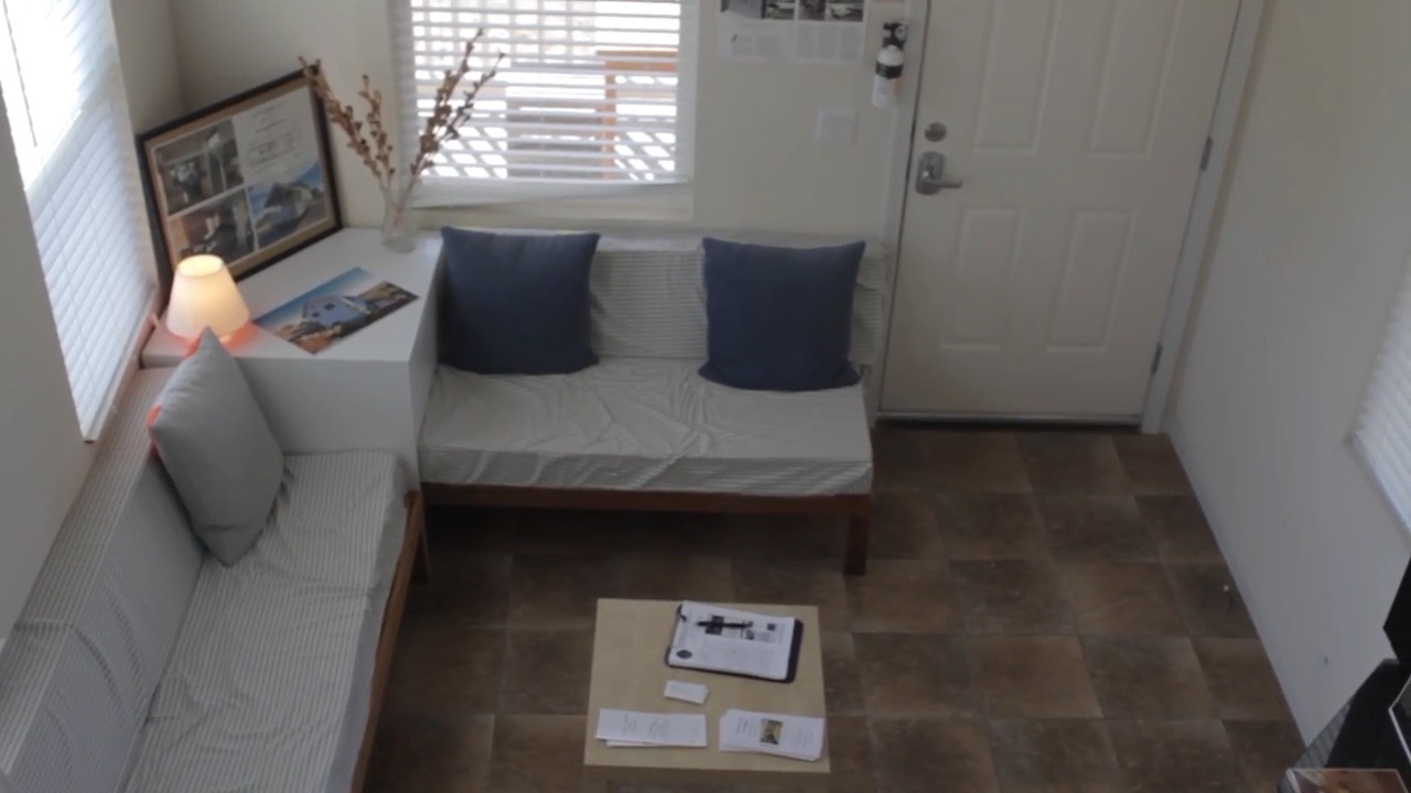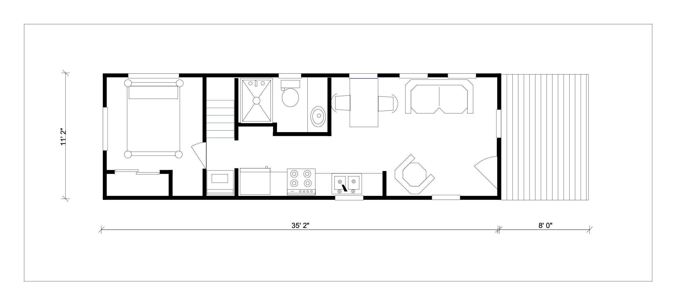 A small dining table with 2 chairs can be placed opposite to the counter or you can use this space to place a regular sized fridge. The bedroom can hold a moderate double bed while the loft can be used to place a queen sized mattress to sleep up to two people comfortably. The French doors of the closet are mirrored to provide both style and utility while the bathroom has an amazing vanity along with a toilet and a big showering pan.