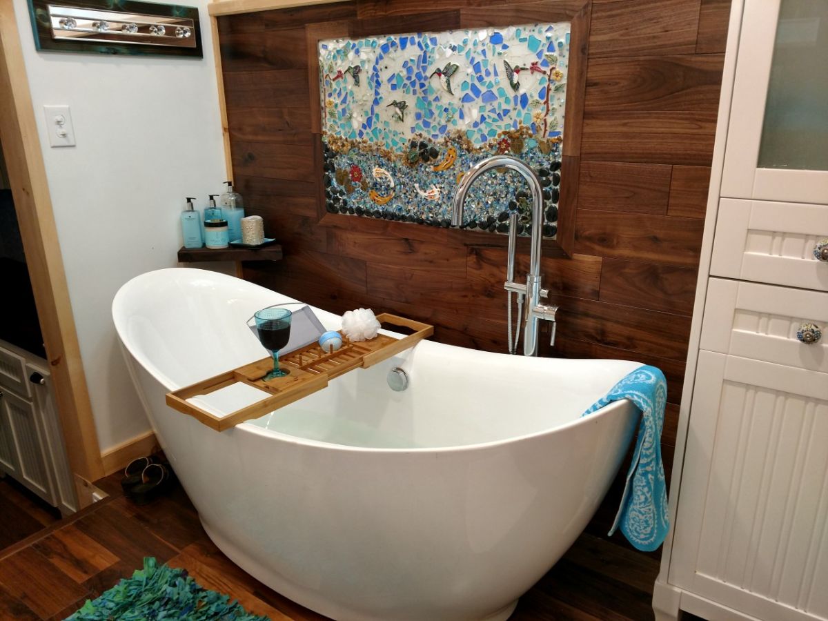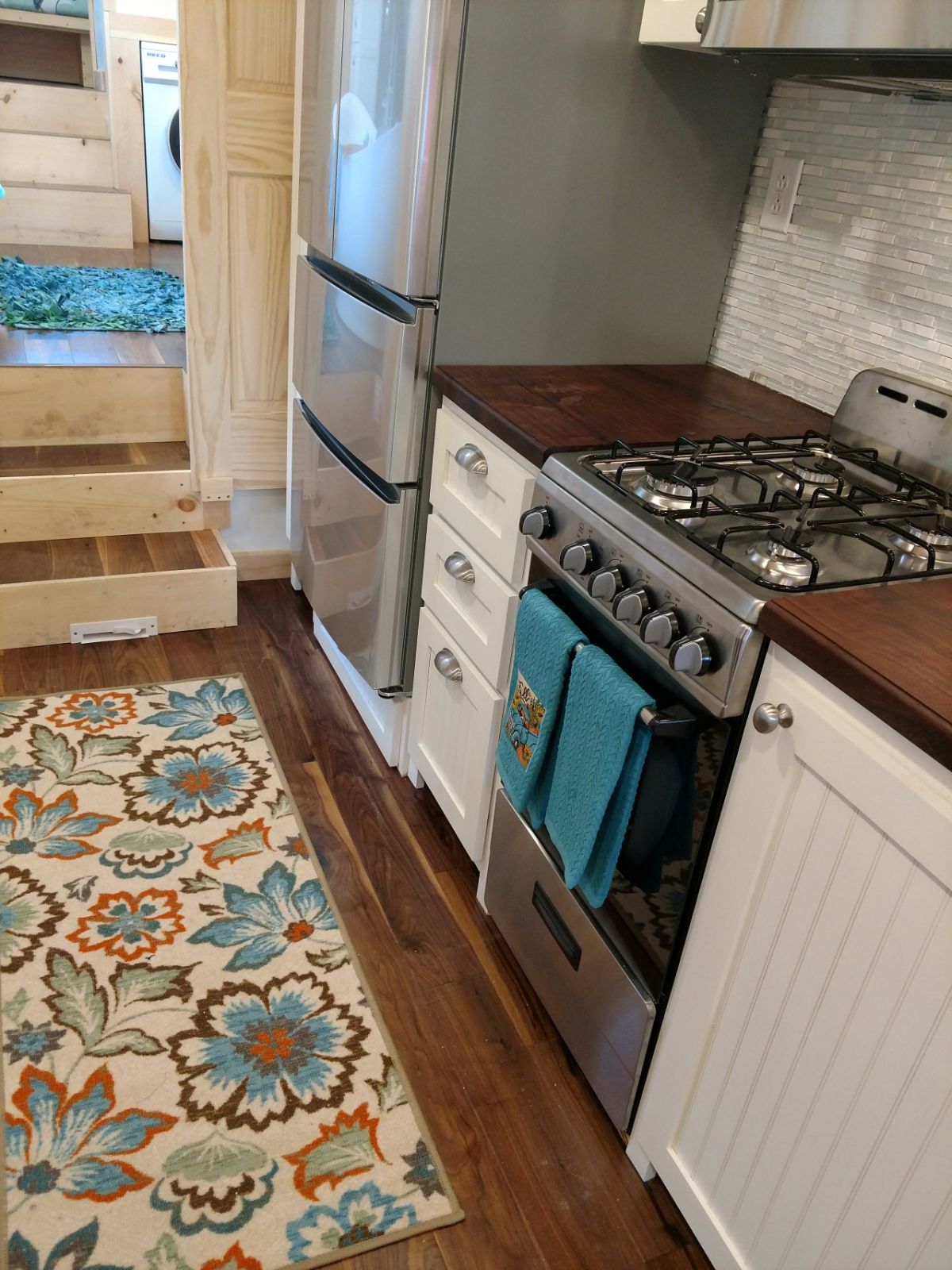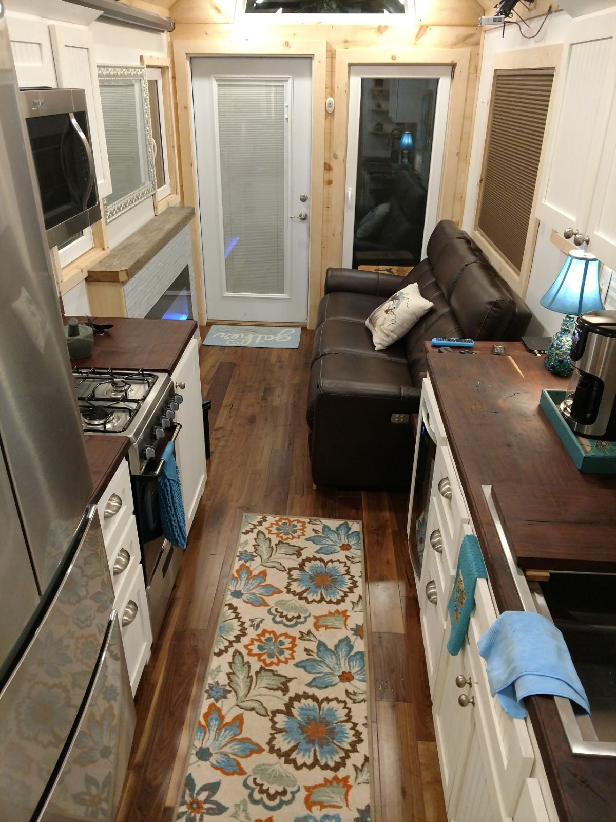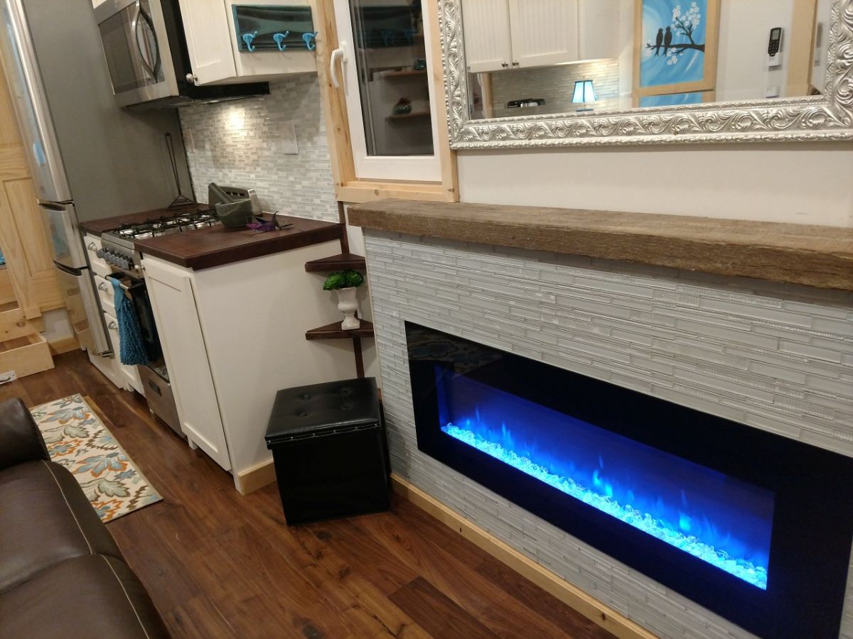 The stunning arrangement of 13 luminary European style windows pours natural sunlight in the house, keeping it warm and well lit. The interior is very welcoming and demonstrates a stroke of architectural brilliance. The walnut hardwood flooring runs across the entire house that is sturdy and has a good shock resistance capacity. The small single kitchen countertop is made up of black walnut hardwood with an inset 33 inch stainless steel sink, a regular faucet and a 20 inch gas stove. You also get a side by side refrigerator with double freezer drawers and a residential microwave for your convenience.