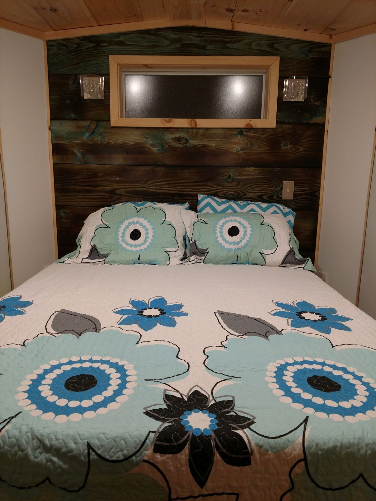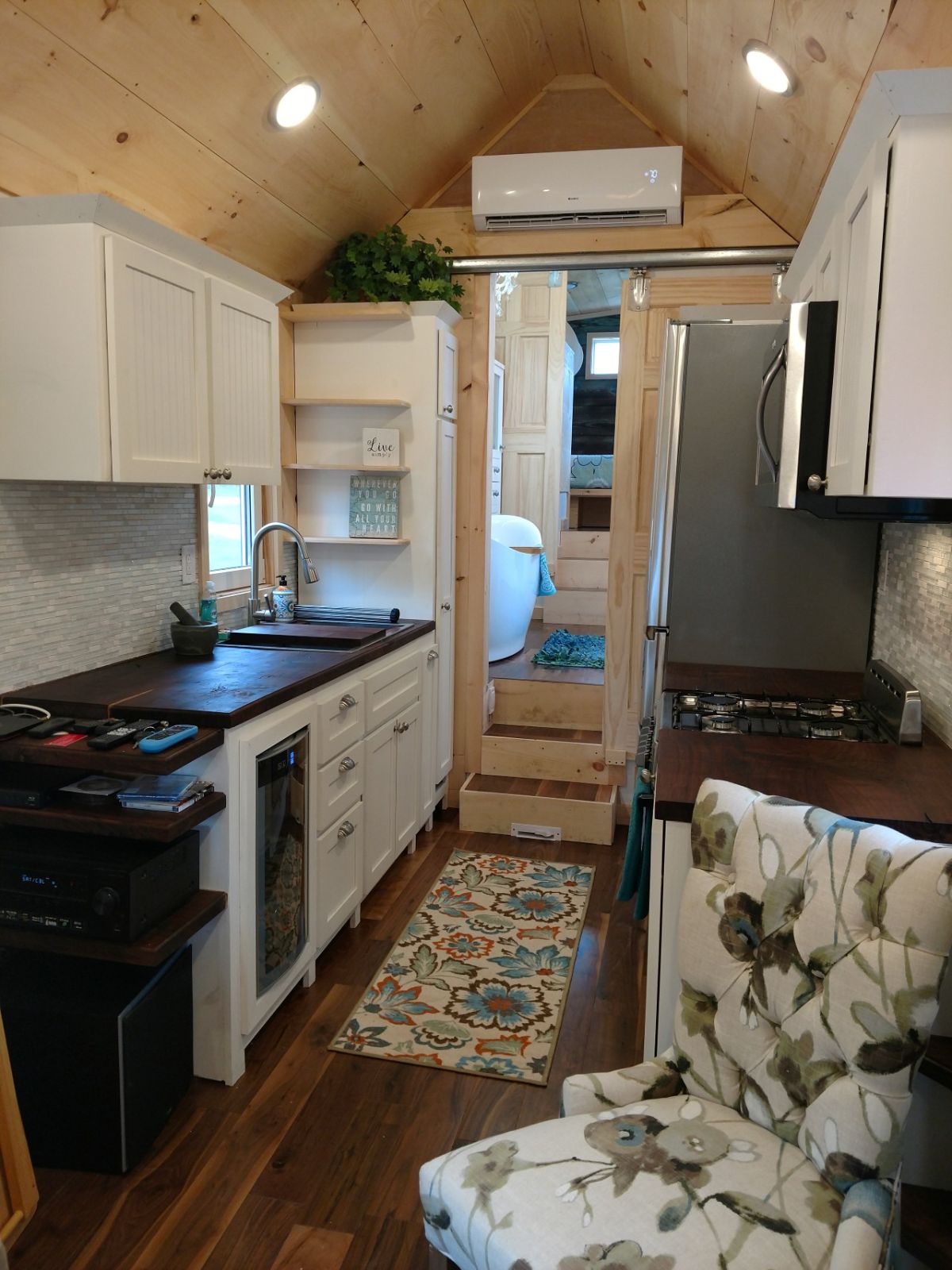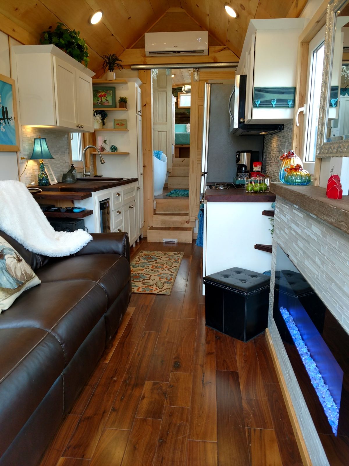 The luxury 40 derives its name from its formidable 40 feet length. This length includes a 2 feet long overhang over the front door is present to provide protection along with a feet long extension at the back. The exterior put on a fine display of a two in one styled theme through the roofs where one is a cathedral and the other a straight one and through the dualism of both horizontal and vertical wooden lap siding. Sticking to the theme even the white and grey window frames are two toned. The long glass front door has full length blinds and the arch window brings out the serenity of this tiny house.