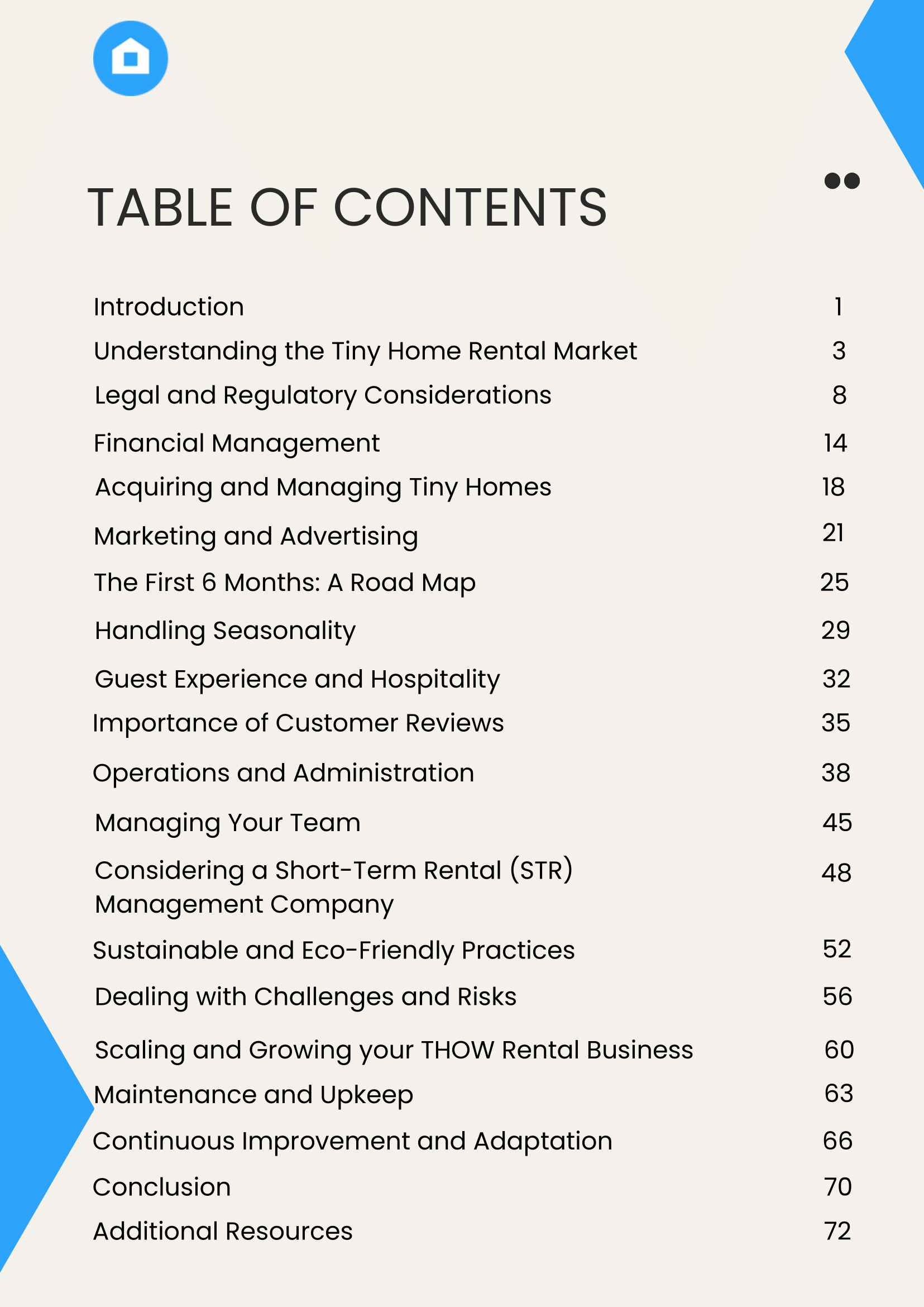 "Managing your Tiny Home Rental Business" is a comprehensive guide for anyone looking to start or grow their tiny home rental business. This ebook covers all aspects of managing a successful rental business, from marketing and pricing to operations and maintenance. With practical tips, real-world examples, and expert advice, this guide will help you navigate the challenges and opportunities of the tiny home rental market. Whether you're a new or experienced rental property owner, "Managing your Tiny Home Rental Business" is an essential resource for achieving sustained success and profitability.