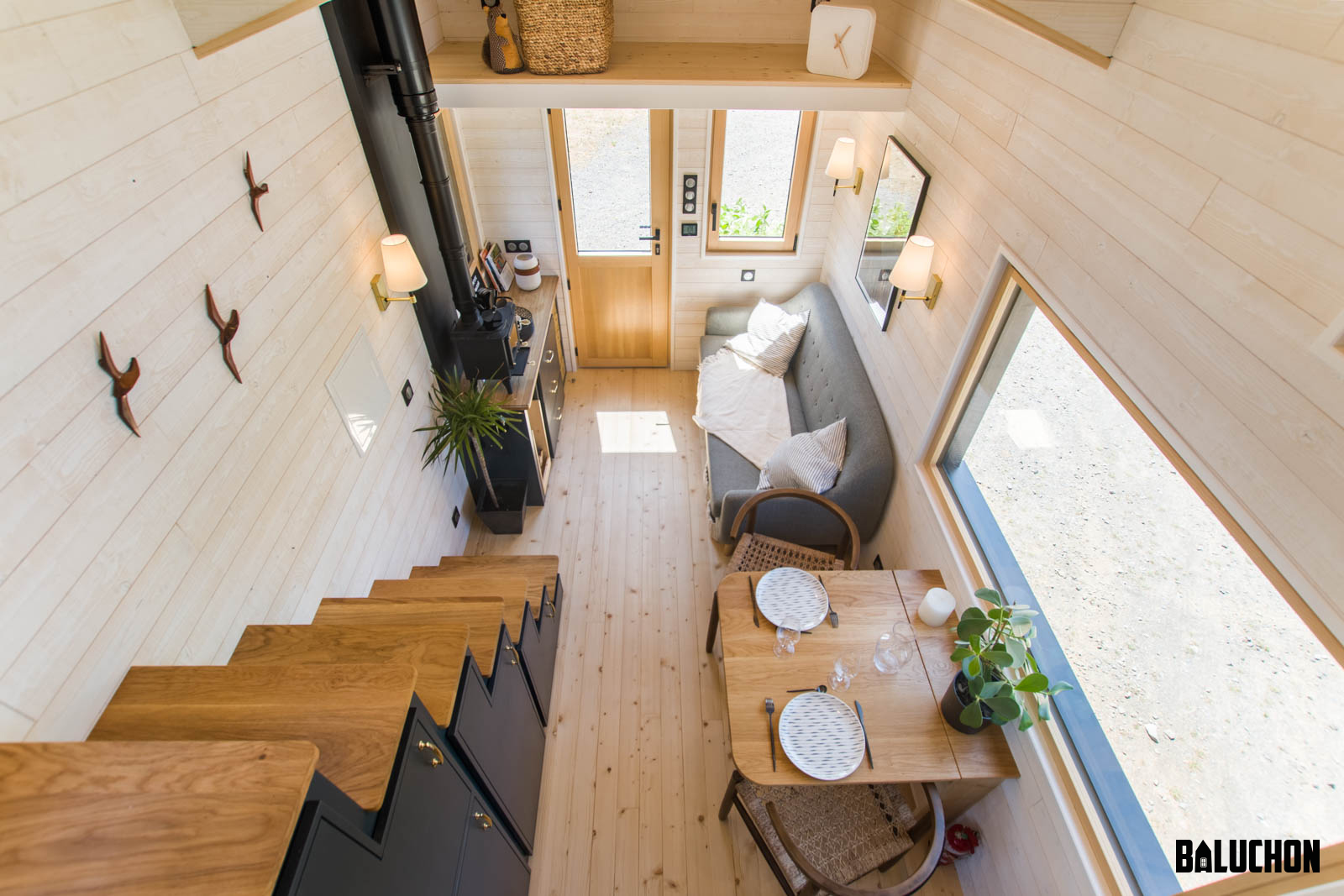 The colour scheme of black and brown creates a contemporary theme while the structural design aids in making it pass as an elite tiny house. Most tiny houses don’t showcase many style factors embedded in the exterior and only focus on the interior design but the Martolod has various aesthetic elements that add on to the house’s overall beauty. A small chimney present in the black roof along with an aluminium marine anchor affixed in the front wall looks very elegant. A small aluminium planter which is also coated in black is placed beneath the window.