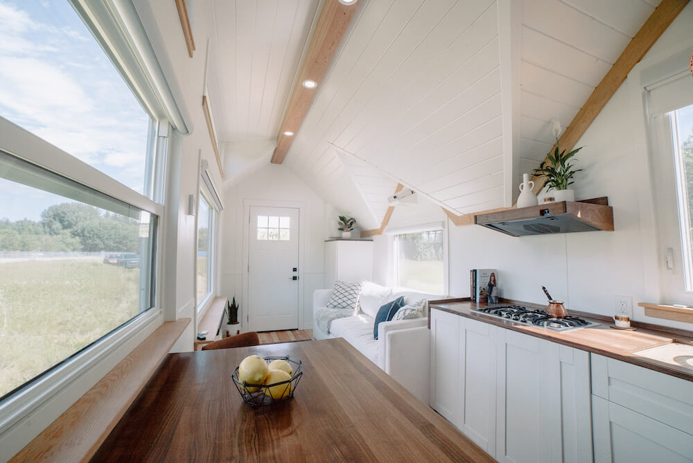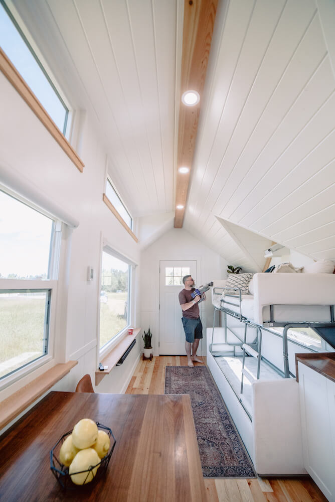 As we move inside, you'll see the living room which is more than a 2 trick pony. Decked out with stow-able coffee table, transformable couch into bunk beds, and projector that's setup to use the back of the blinds as the screen! I love that this home is full of big picture windows and the TV doesn't have to take up and crucial window space.