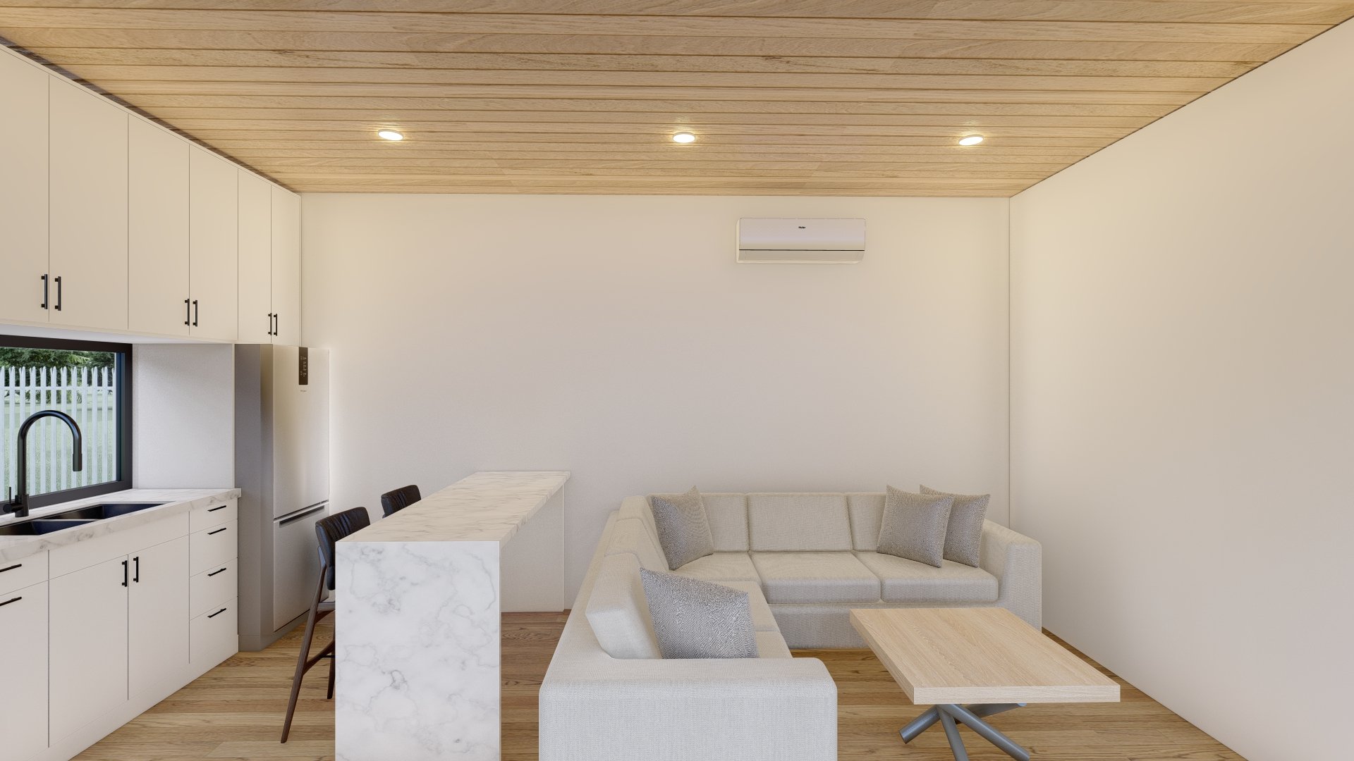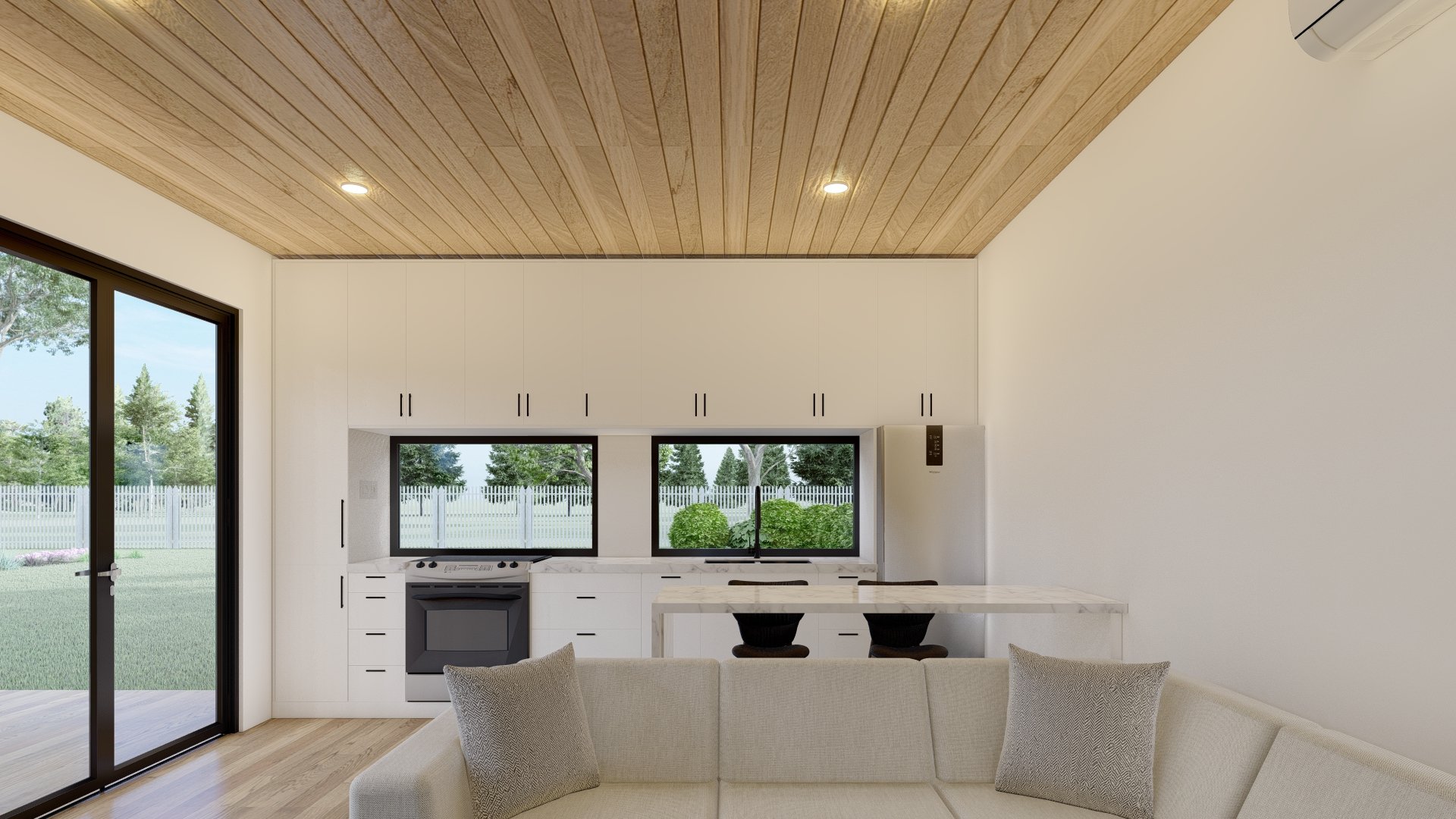 Upon entering the Model 640, you're welcomed with a warm and inviting open-concept kitchen and living area. A striking quartz waterfall island serves as the centerpiece, providing ample space for meal preparation and casual dining. This open layout is enhanced by a double set of glass sliders, which, when fully opened, create a seamless indoor-outdoor connection. The abundance of natural light streaming through the space creates a warm and welcoming atmosphere, making it the perfect place to relax or entertain guests.