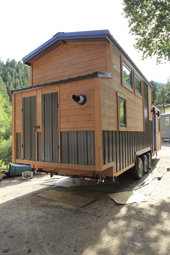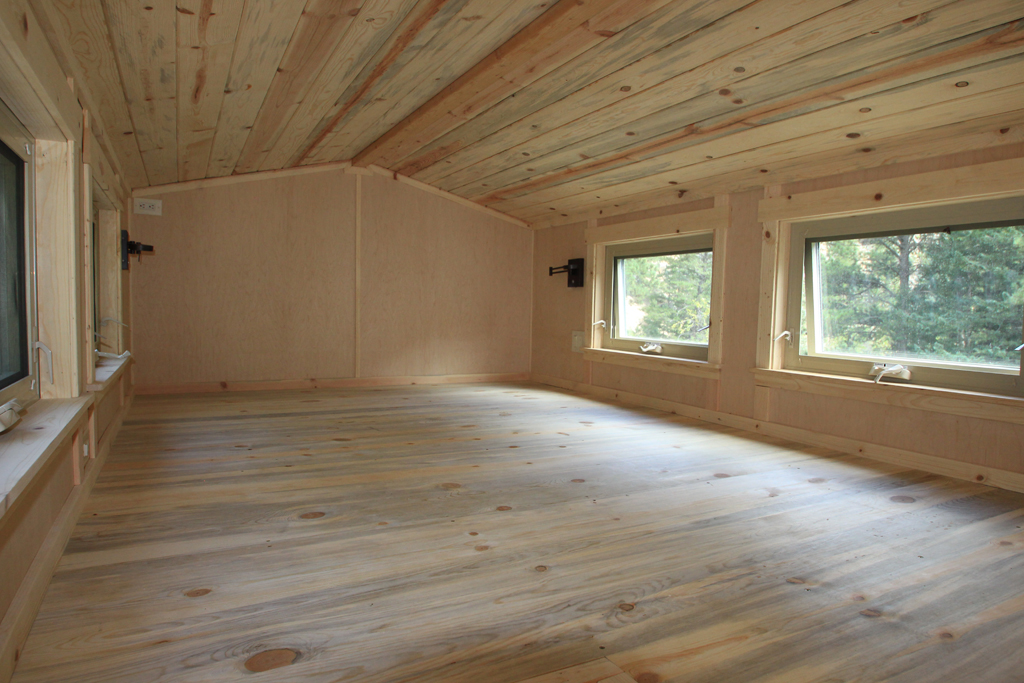 The chic exterior horizontal lap siding is done with pine tongue and groove while the pattern with vertical siding is made up of Lifetime Steel metal. The same materials are used in the frames of the windows and the roof respectively. The dual styles of the roofs only add up to its charm and prevent rainwater damage or leakage. The miniature garage affixed on the rear side offers extra space for storage. The indoor main floor has cork flooring which resists cracks and scratches effectively.