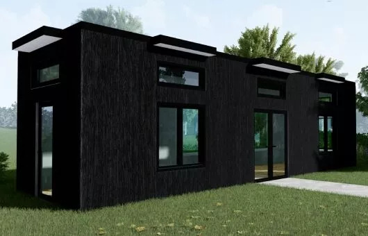 Live Large ADUs' Namaste tiny home is a unique and breathtaking design that showcases 14 large windows, three glass doors, and two skylights that flood the interior with natural light and stunning views of the great outdoors. This 400-square-foot ADU shell is 40 feet long, 11 feet wide, and 11.5 feet high.