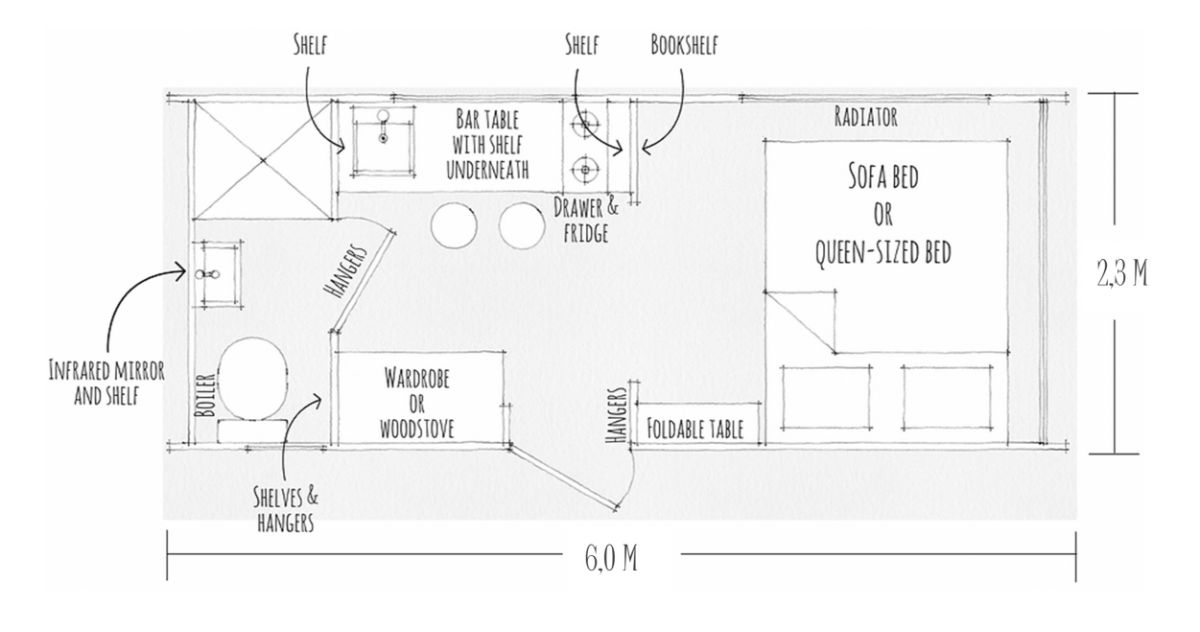 Bathroom: Compact yet comprehensive. From refreshing showers to the essential sink and toilet, each element is curated to perfection. Don’t forget the hot water heater for those chilly mornings!