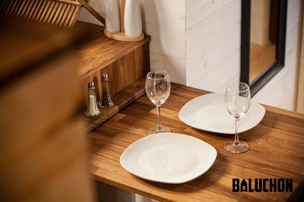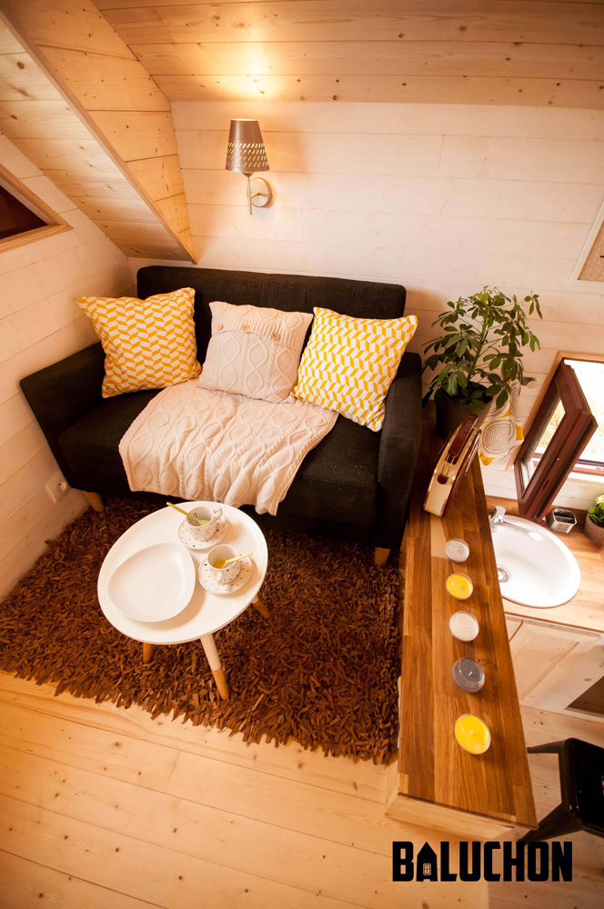 The Odyssée doesn’t follow the traditional tiny house layout plan and instead of the main floor, the living room has been placed on an elevated platform to keep the relaxing space separated from the rest of the house. A single loveseat sofa is positioned here in front of a small circular coffee table to let the residents lounge comfortably. A rug is placed beneath the living room furniture to elevate the look of this place by adding a piece of interior décor that binds all the other elements together. A lamp sconce is also provided here to keep the place well-lit when natural light doesn’t.
