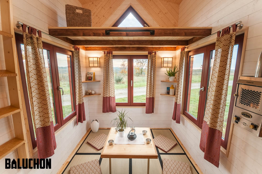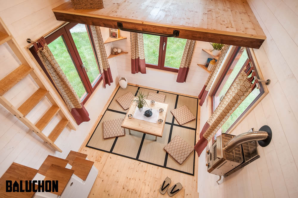 The Japanese stairs have built-in storage capacity that provides extra utility while also presenting themselves as a stylish interior décor feature. The other loft above the living room can be accessed through the oak steps ladder that can be removed and kept aside when it is not in use so as to not cause any unnecessary obstacles in the relaxing zone. The double loft layout makes this house a great option for a small family as the Ondine can accommodate up to 4 people conveniently.