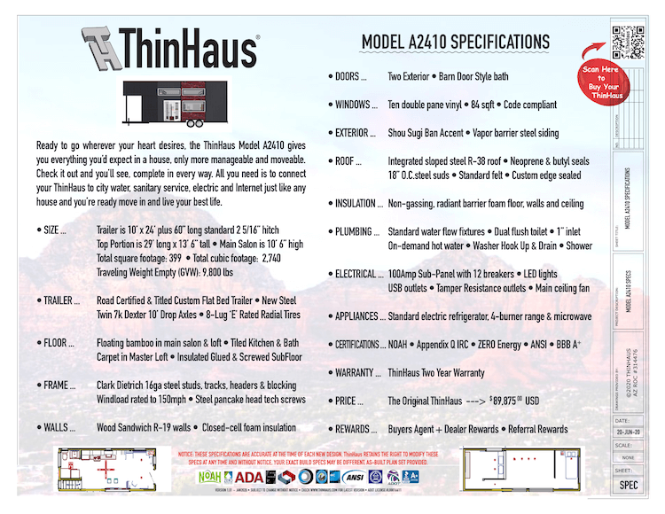 ThinHaus uses ALLSteel A2410 AKA the Onyx is built 10' wide and framed with steel rather than wood. This keeps the tiny house light weight and brings an extra layer of strength and longevity to the small home.