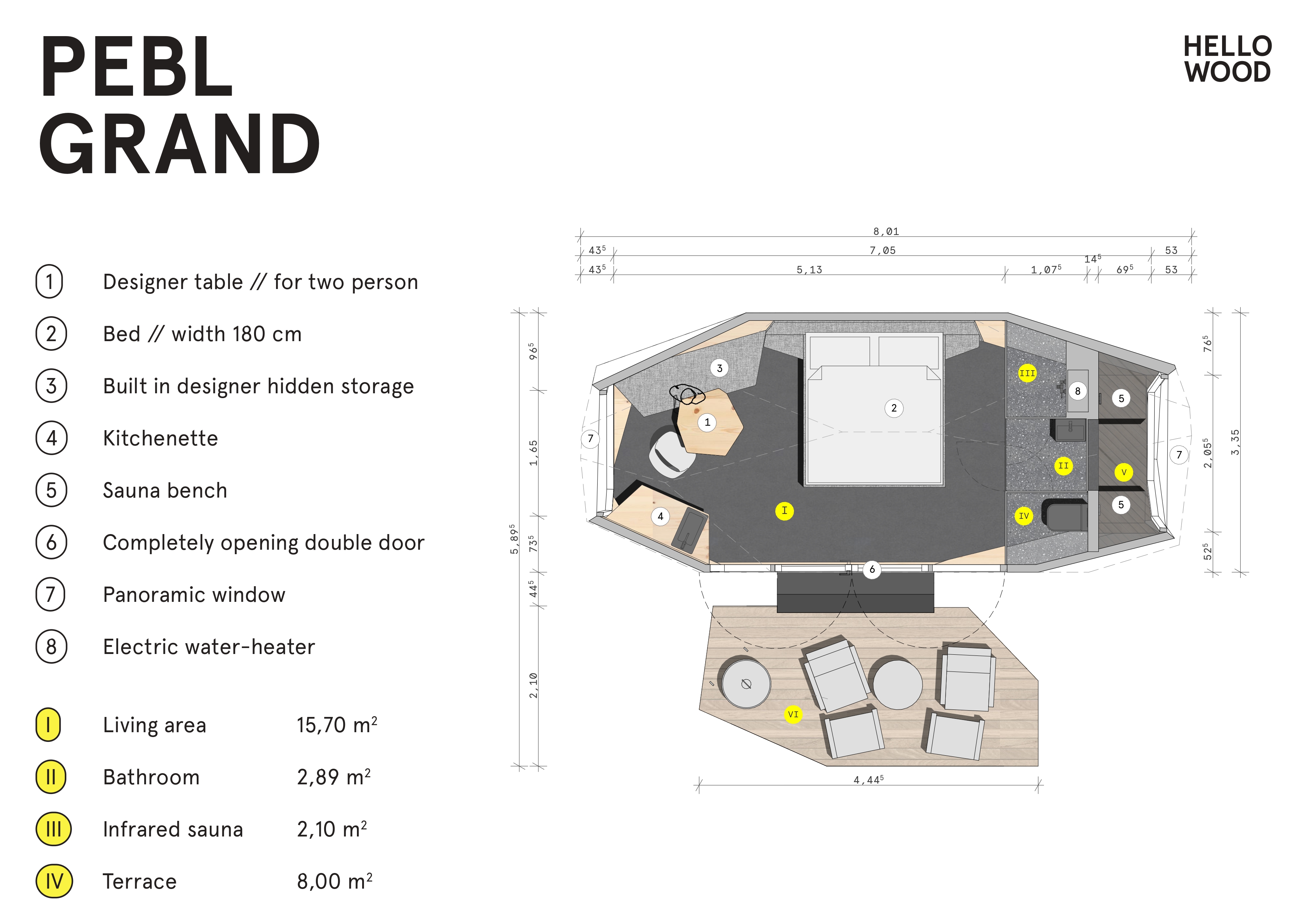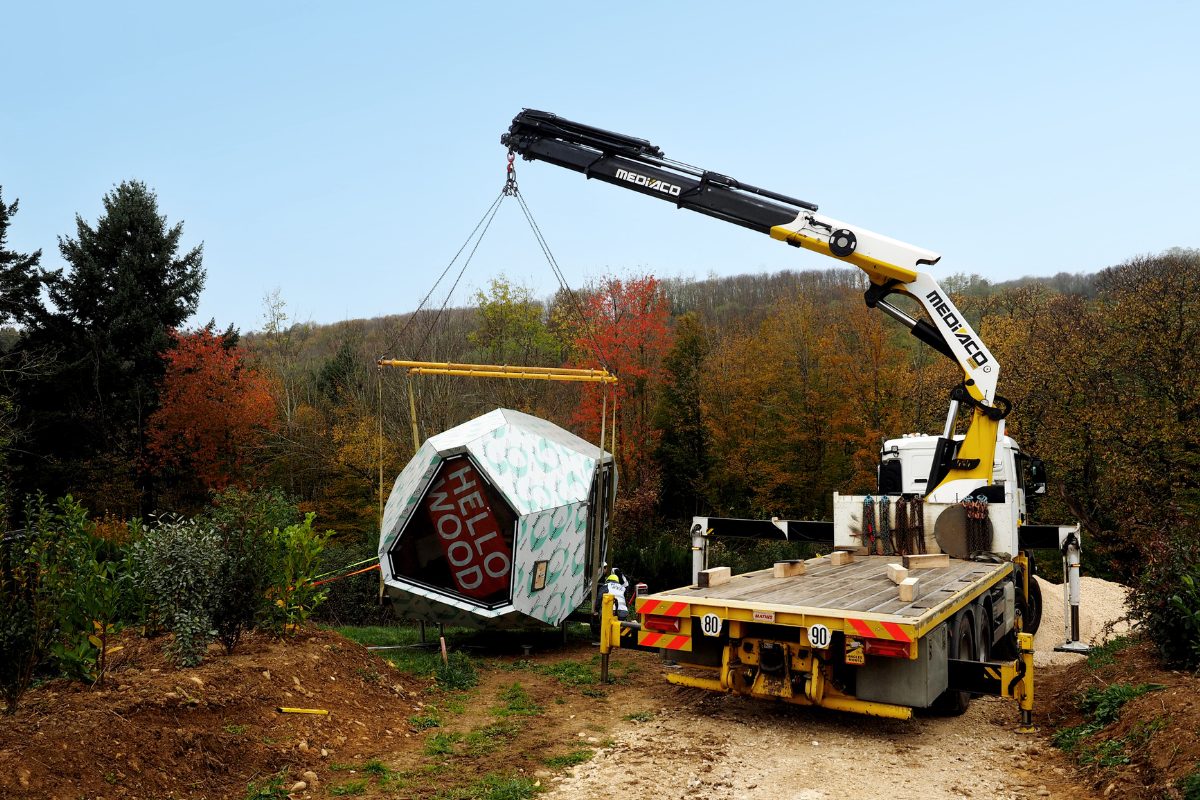 A major innovation behind the structure is Hello Wood’s custom-developed sandwich panel system. This method combines the structure, exterior cladding, and insulation into one element, streamlining the build without sacrificing performance. This allows the PEBL Grand to maintain its distinct geometry while offering strong thermal protection and long-term durability.