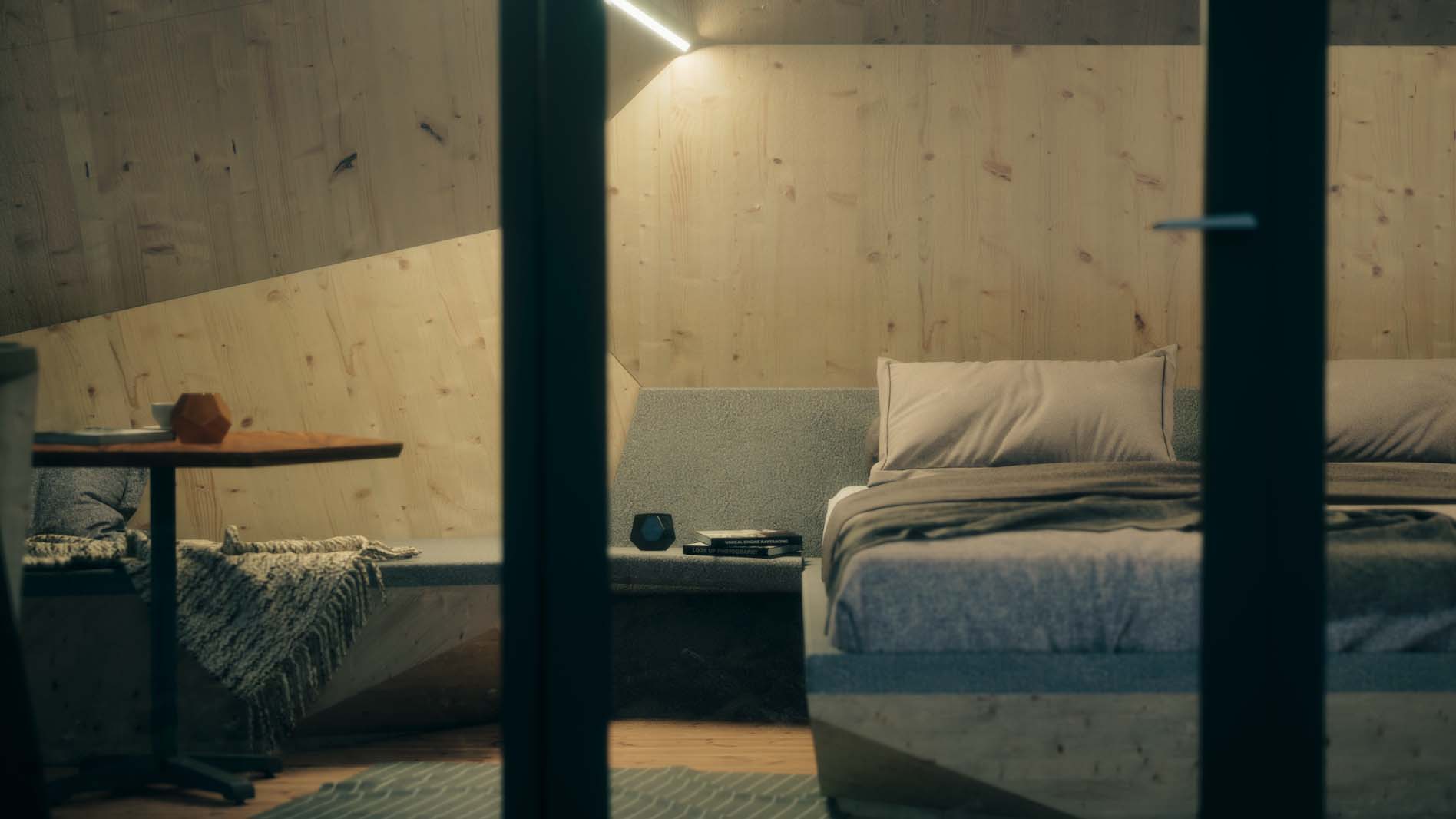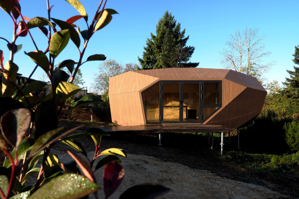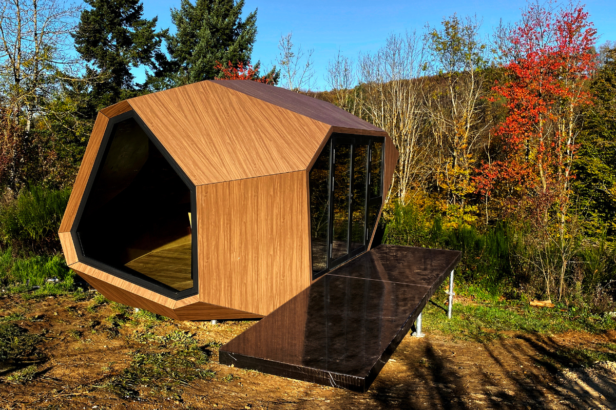 From the outside, the PEBL Grand doesn’t look like your typical cabin. Its angular, faceted shape gives it a modern and slightly industrial feel, but one that still fits naturally into a wide range of settings—whether surrounded by trees, placed on a hillside, or even set up in an urban area. The design avoids looking too temporary or too rigid, making it visually adaptable to different environments.