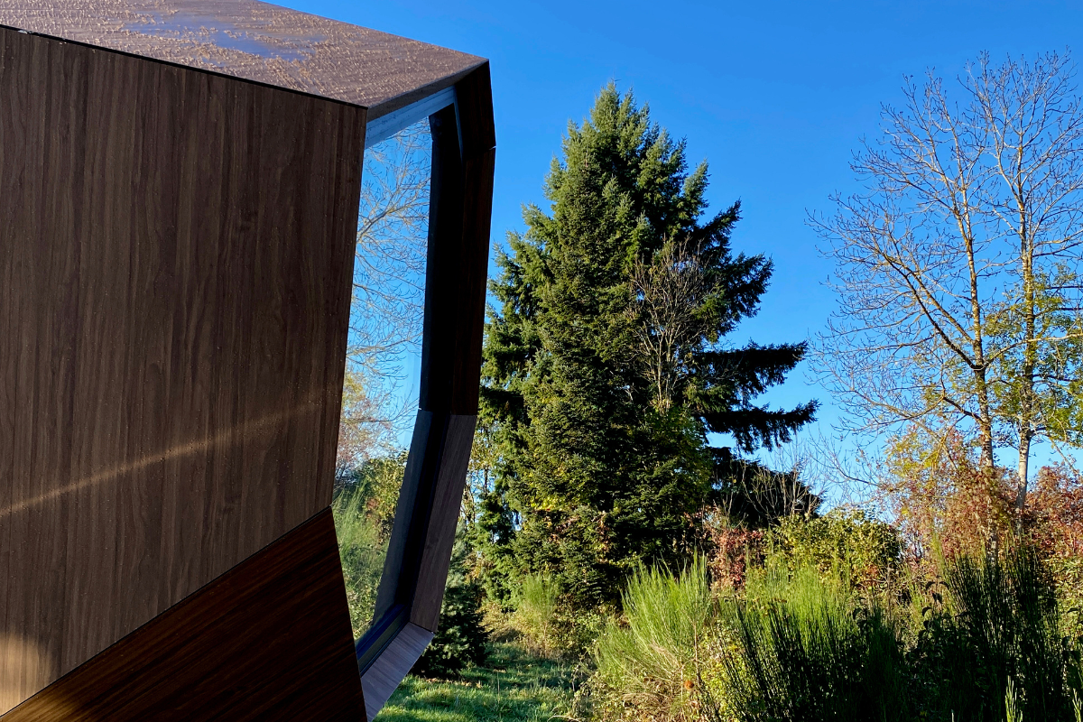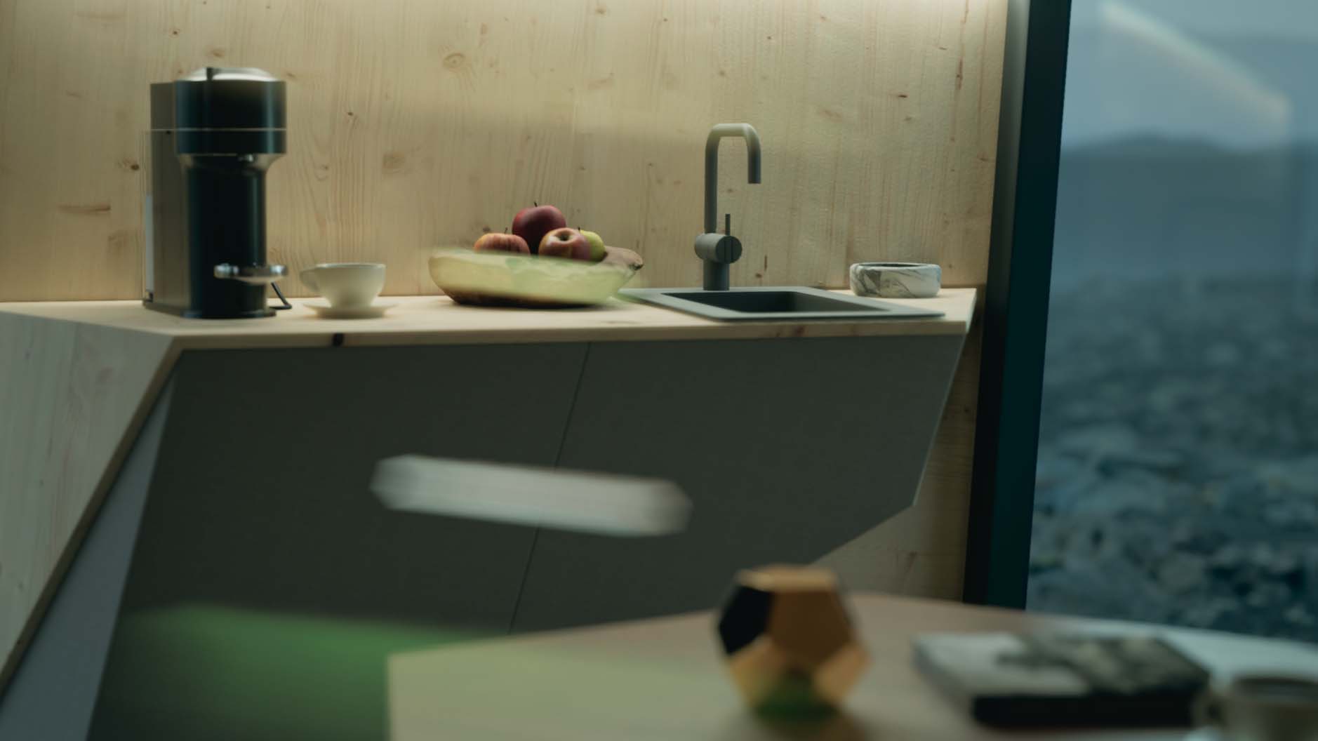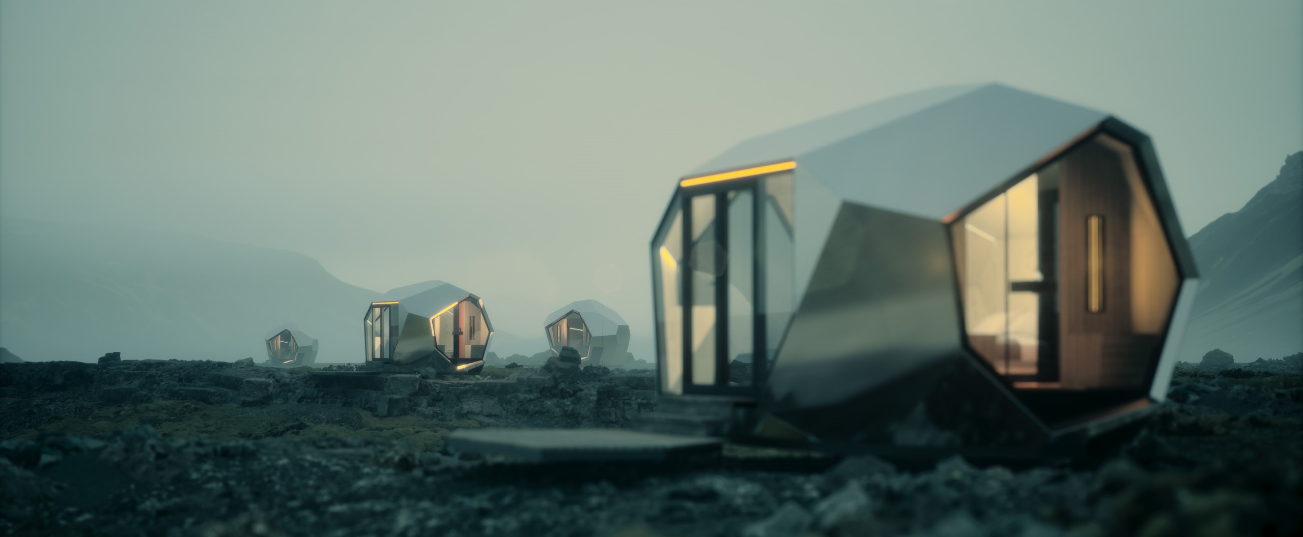 From the outside, the PEBL Grand doesn’t look like your typical cabin. Its angular, faceted shape gives it a modern and slightly industrial feel, but one that still fits naturally into a wide range of settings—whether surrounded by trees, placed on a hillside, or even set up in an urban area. The design avoids looking too temporary or too rigid, making it visually adaptable to different environments.