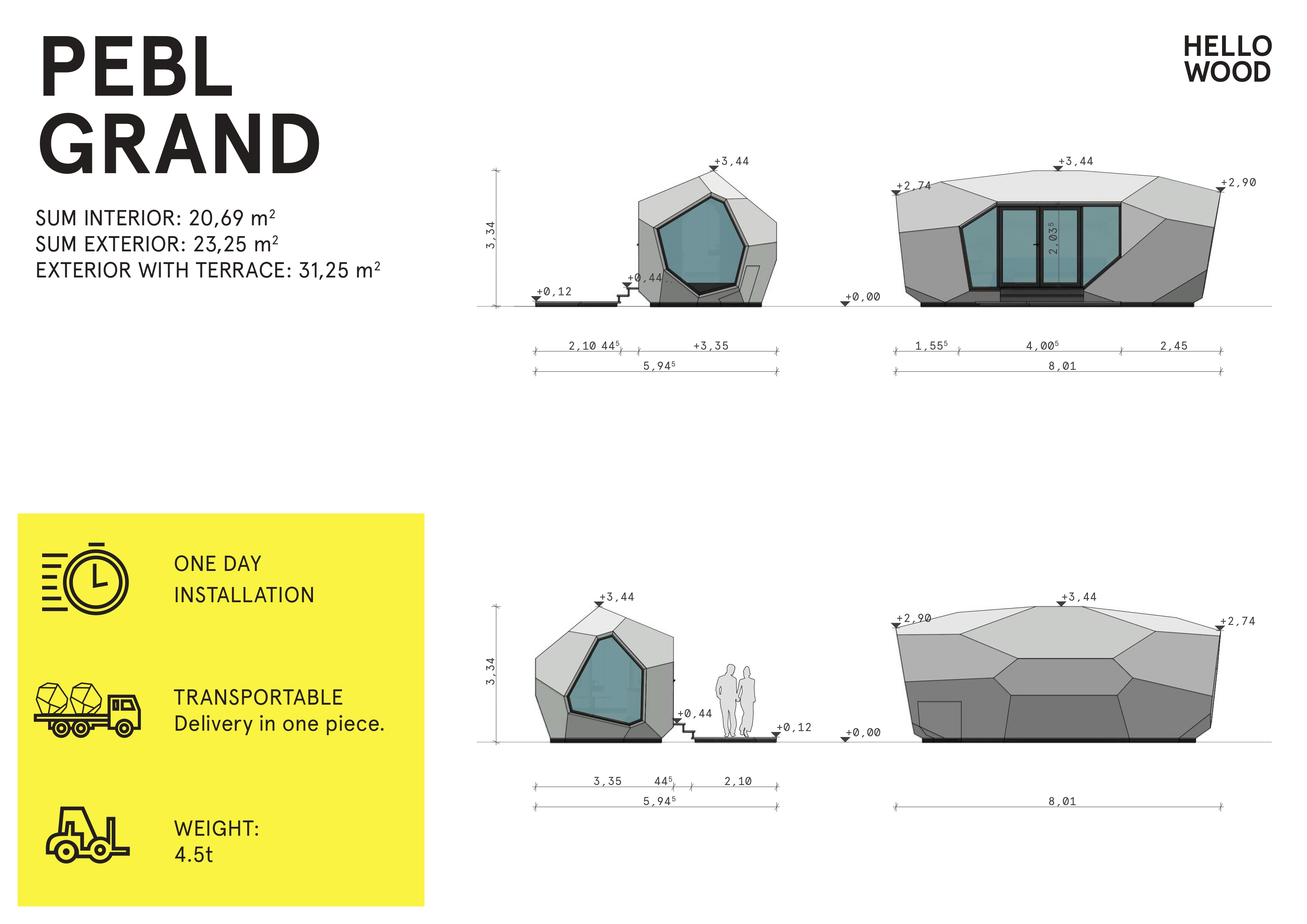 The PEBL Grand by Hello Wood is a smart evolution of compact living, offering a balance of design, comfort, and flexibility. As the larger version of the original PEBL cabin, it reflects over a decade of architectural experience and refinement. Designed with both aesthetics and function in mind, this tiny home stands out with a form that feels sculptural yet intentional.