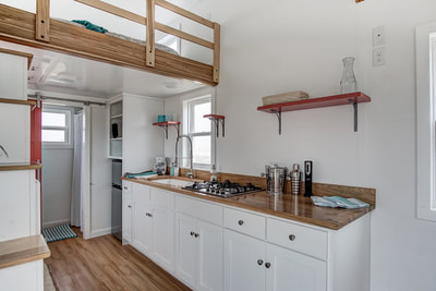 The kitchen in Poppy is a chef's dream. The custom cabinetry and floating shelves provide ample storage for all your culinary essentials, keeping everything organized and easily accessible. The hickory countertops not only add a touch of natural beauty but also offer a durable and functional workspace for your cooking endeavors. The 30" stainless steel undermount sink combines practicality with a sleek look, while the 4-burner propane range allows you to unleash your culinary creativity. The apartment-sized stainless steel refrigerator keeps your groceries fresh and easily accessible.