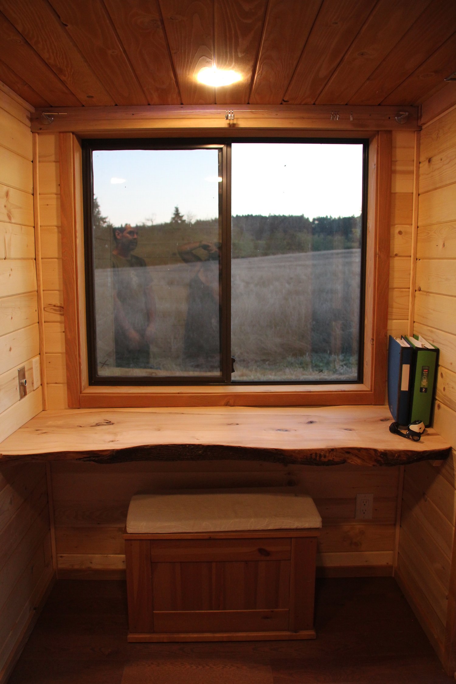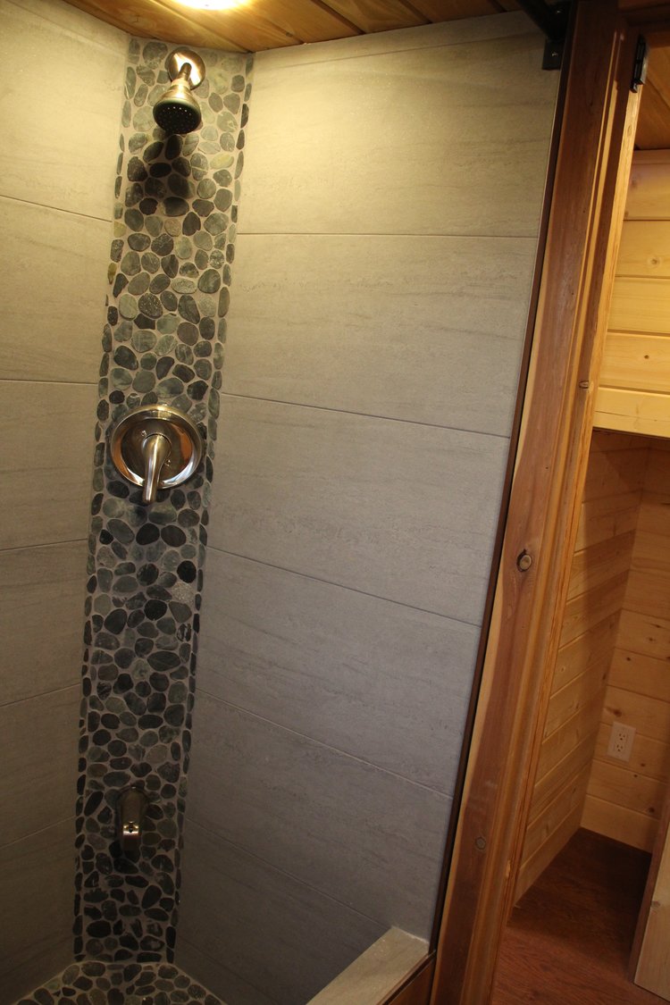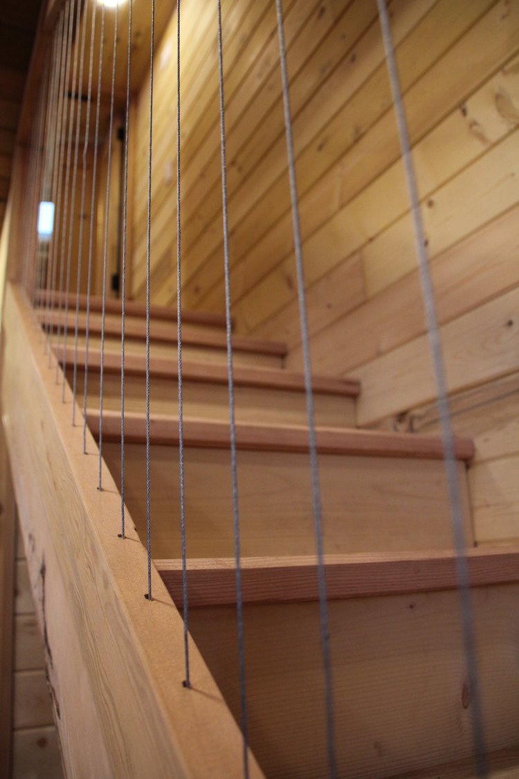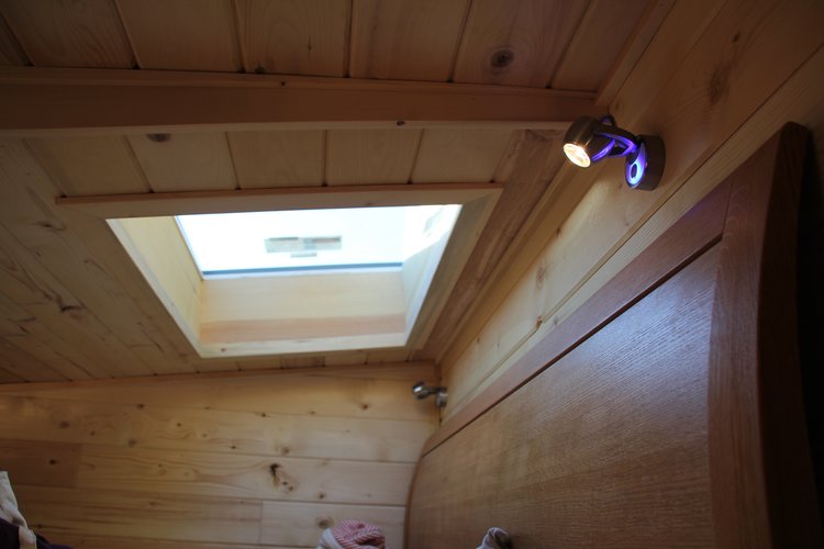 The stairs leading up to the bedroom loft come with a mezzanine railing for support and protection. The living room holds a wood stove heater that makes your lounging experience cosy and comfortable. The bathroom is made up of Cedar and is equipped with all the required amenities. A white oak office desk is affixed in the wall underneath a broad window which makes working here convenient and pleasant.