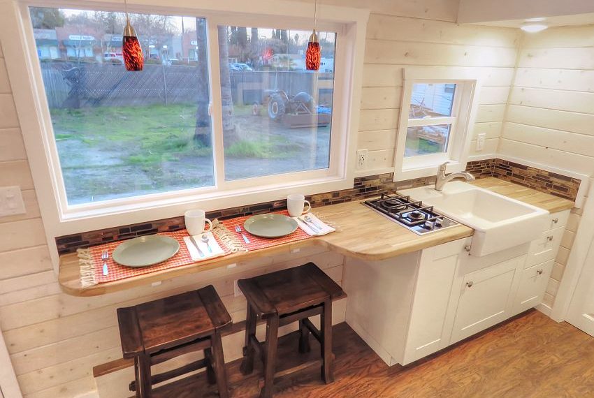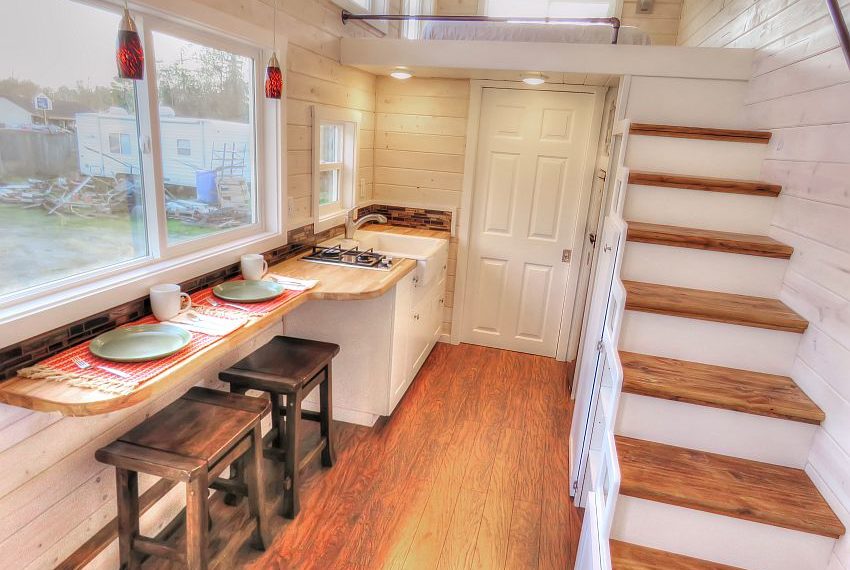 The twin loft style has to be one of the most amazing features offered by the Roomy Retreat, as it is not a common feature present in a lot of tiny houses. The main floor is commodious and provides comfort in various ways. The main floor consists of a kitchen and a bedroom, whereas the dual staircases lead up to the two lofts. The kitchen is equipped with a sturdy counter that holds a 2 burner propane cooktop along with a versatile and gorgeous butcher block bar that can serve multiple purposes and can be used for preparing food and can also double up as a dining table for two.