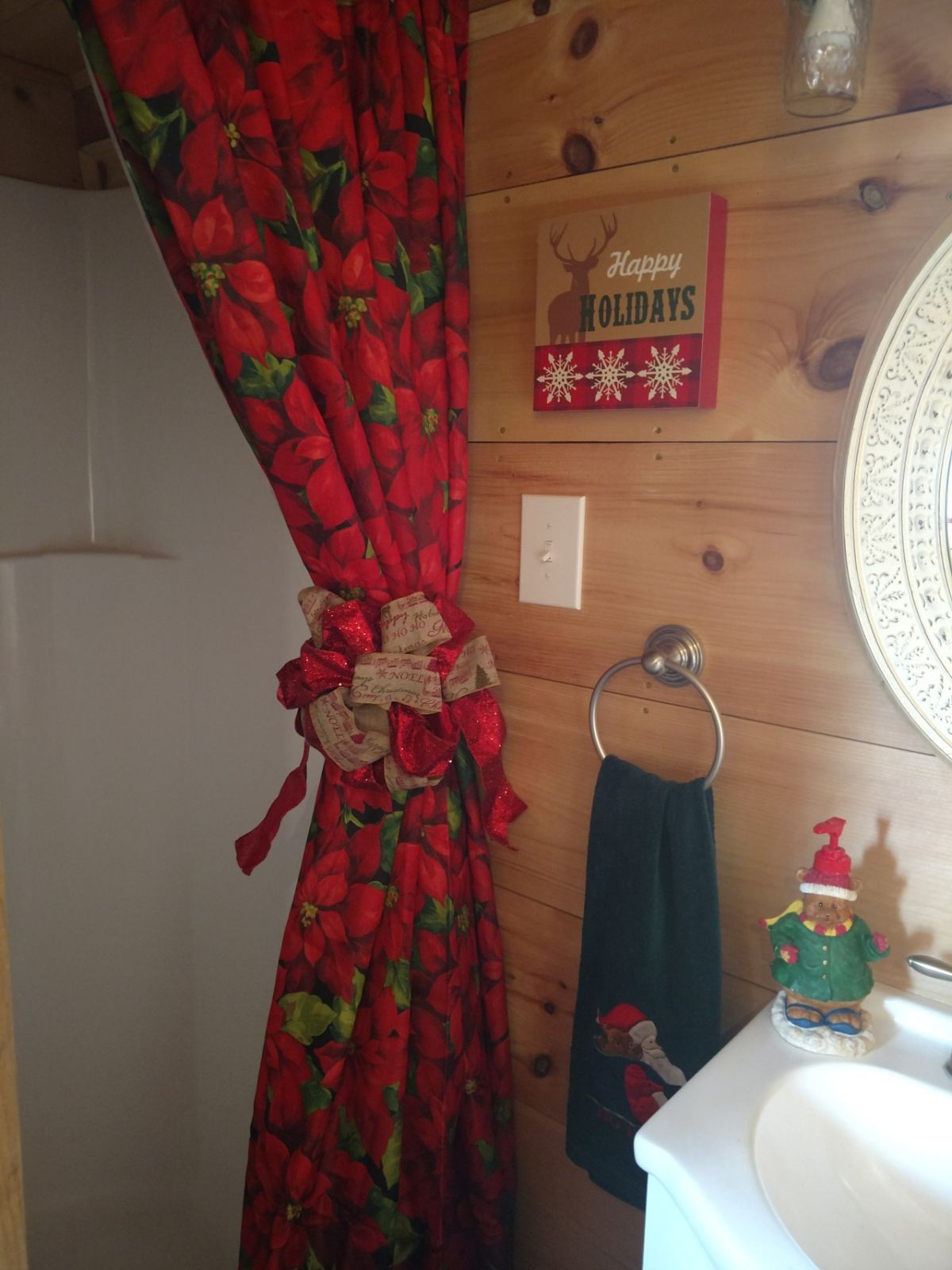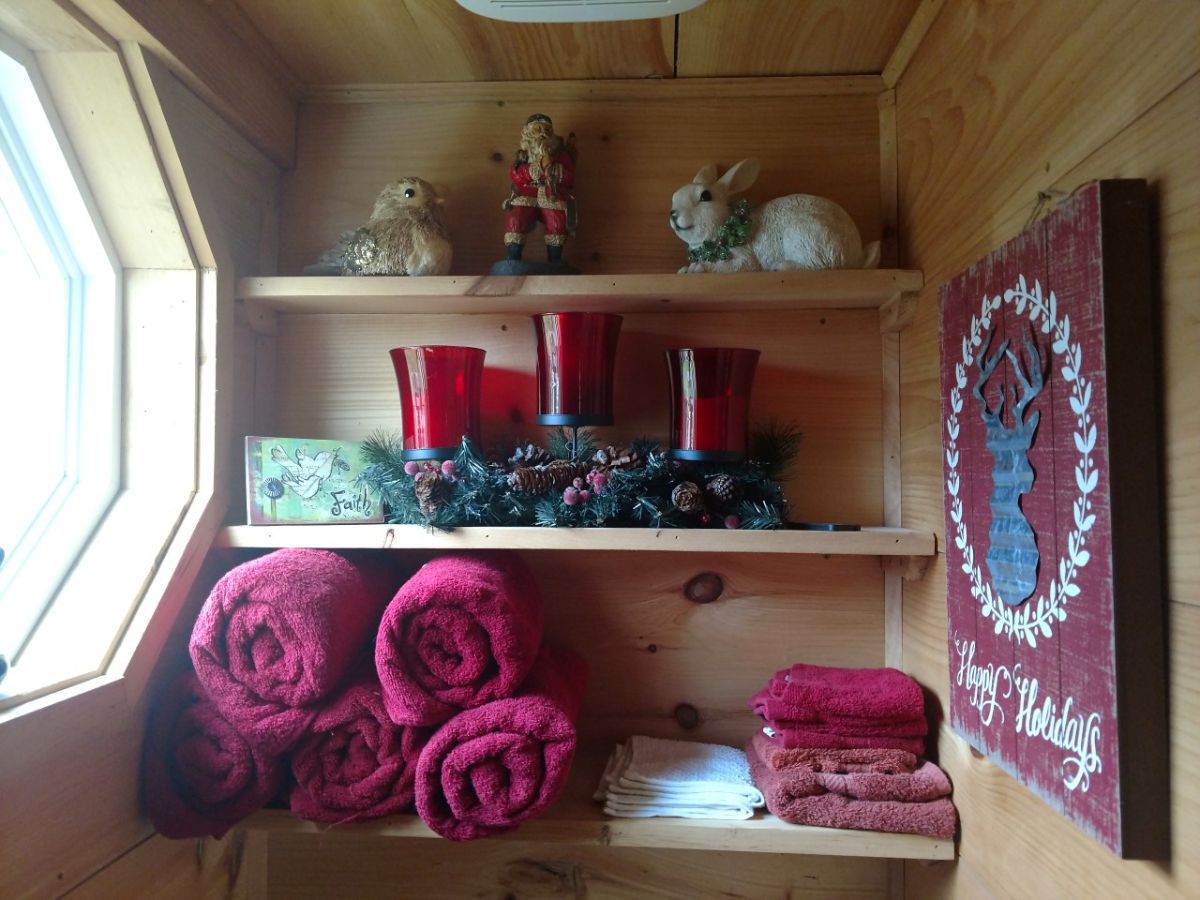 The bathroom consists of a porcelain wash basin along with a fibreglass shower affixed to the wall and a standard residential flush toilet. There is just enough space provided in the washroom with rudimentary amenities. The abundance of vertical open shelves, as well as pull out storage cabinets in this tiny house, lets you use an artistic approach and either decorate the vacant space with festive showpieces or simply use it for organizing your possessions.