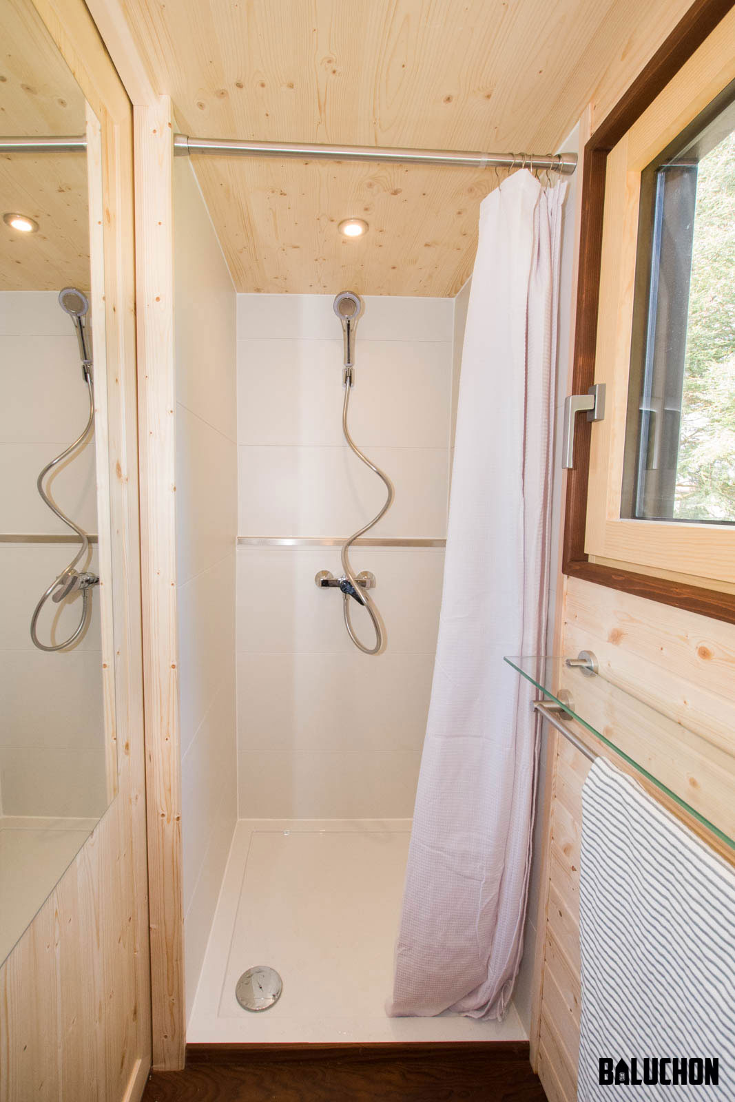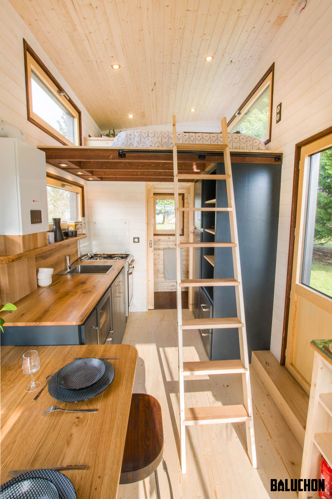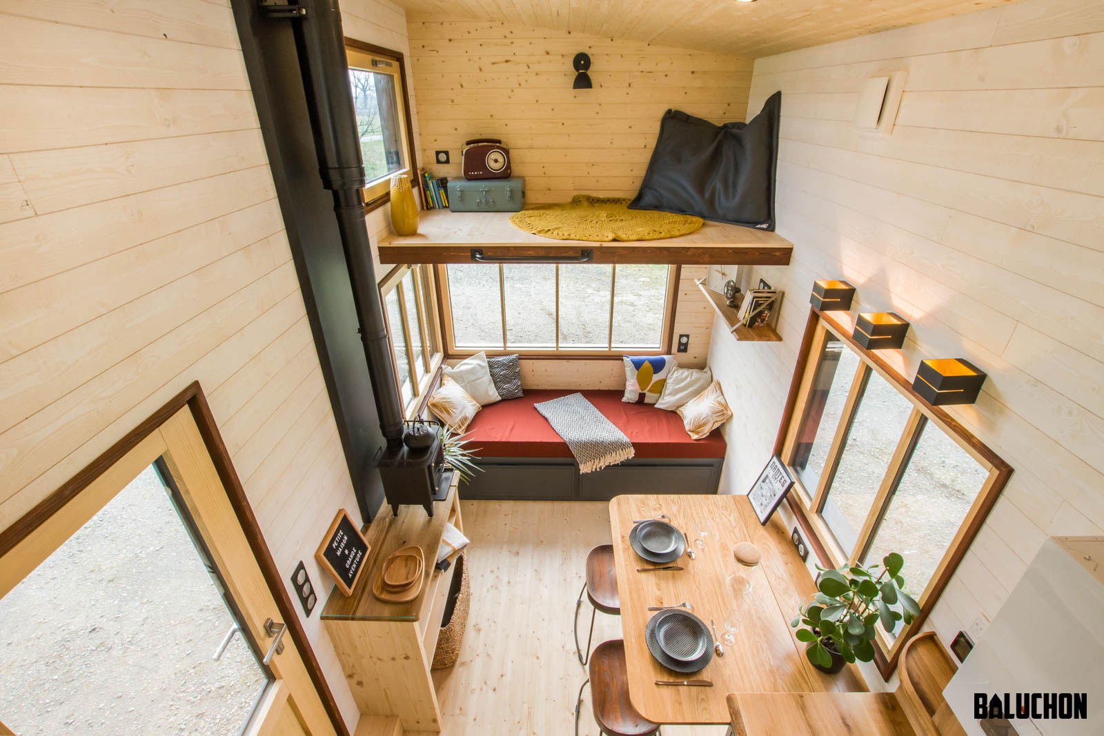 The interiors are bright and beautiful and you get many amazing features. The living room holds a great space saving feature that also provides comfort to the residents in the form of a convertible couch that slides out to become a double bed. You can lounge on the cushioned platform during the day and accommodate your guests during the night. There is a sturdy open cabinet with a glass top placed in the living room which lets you store your goods and chattels. It also has a wood stove fireplace placed on top of it that keeps the residents warm.