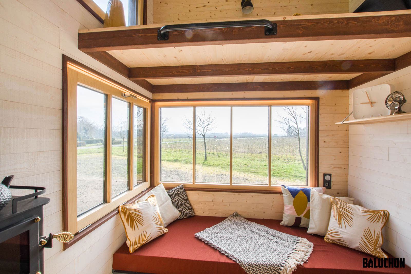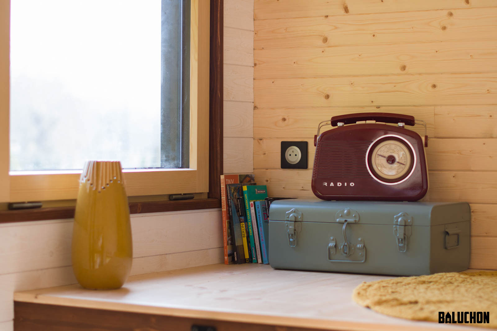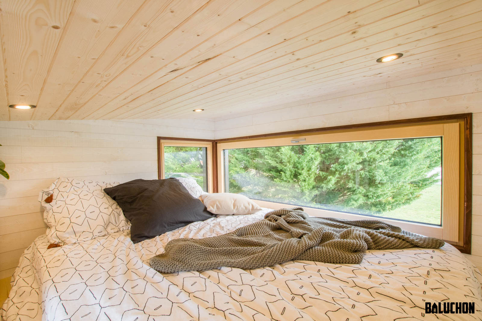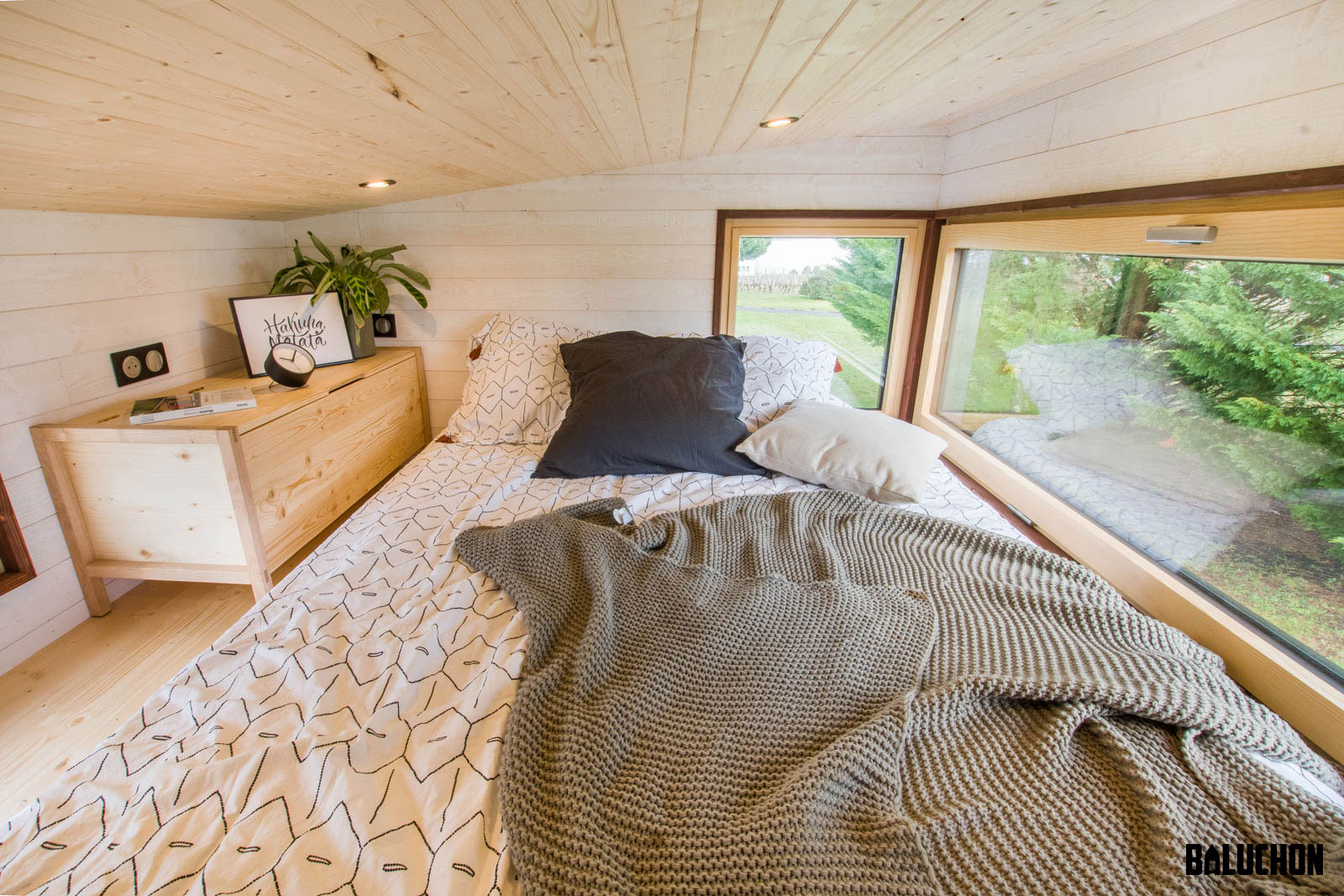 The interiors are bright and beautiful and you get many amazing features. The living room holds a great space saving feature that also provides comfort to the residents in the form of a convertible couch that slides out to become a double bed. You can lounge on the cushioned platform during the day and accommodate your guests during the night. There is a sturdy open cabinet with a glass top placed in the living room which lets you store your goods and chattels. It also has a wood stove fireplace placed on top of it that keeps the residents warm.