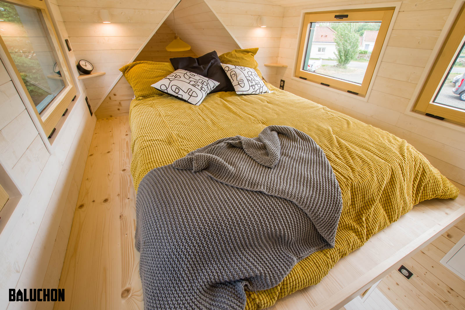 At a time up to 4 people can dine on this or use it for a family night for board games. The two huge windows on either side of the living room keep it especially radiant during the day. To follow in line with other space saving features the three seater sofa pulls out to become a full bed and the staircase leading up to the main sleeping loft has in-built open compartments that can be used for stacking interior décor items to elevate the look of the living area. The bedroom is surrounded by windows and holds a double bed to sleep two people comfortably.