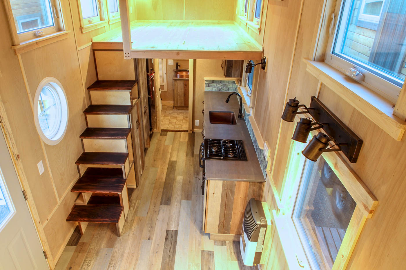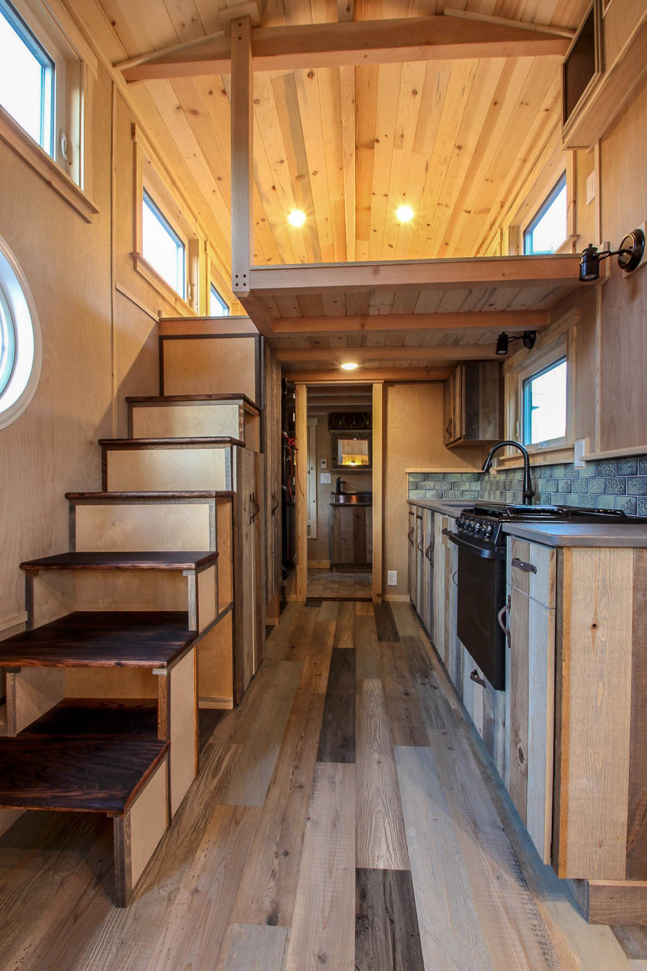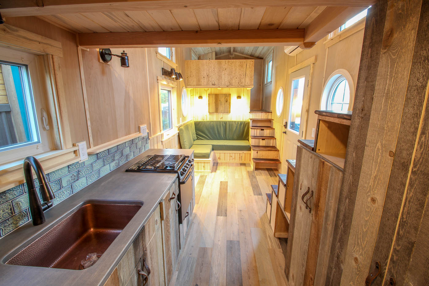 The compact living area can fit a moderate L-shaped sofa onlooking the open kitchen. The abutting stairs lead up to the loft where a king-sized mattress can be easily roomed. On its opposite end is a pair of identical loft and stairs that adjoin the kitchen. A single countertop with a copper sink, 3 burner propane stove, oven and inbuilt custom rustic pine cabinets comprise the kitchen. The space beneath the stairs is adequately used to create cupboards for storing goods and chattels.