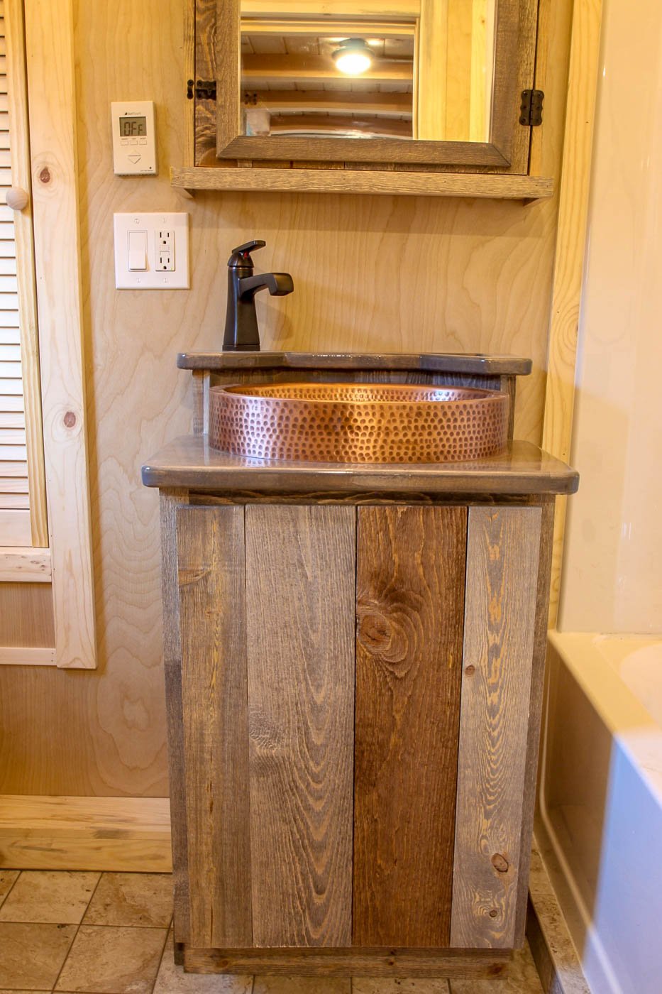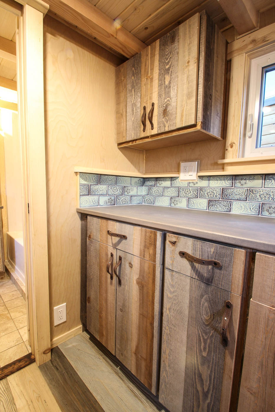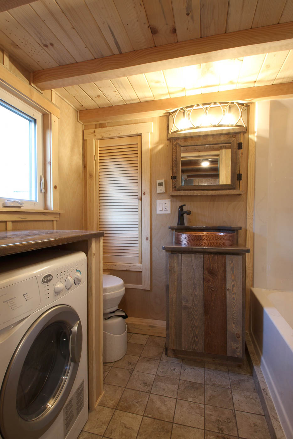 The compact living area can fit a moderate L-shaped sofa onlooking the open kitchen. The abutting stairs lead up to the loft where a king-sized mattress can be easily roomed. On its opposite end is a pair of identical loft and stairs that adjoin the kitchen. A single countertop with a copper sink, 3 burner propane stove, oven and inbuilt custom rustic pine cabinets comprise the kitchen. The space beneath the stairs is adequately used to create cupboards for storing goods and chattels.