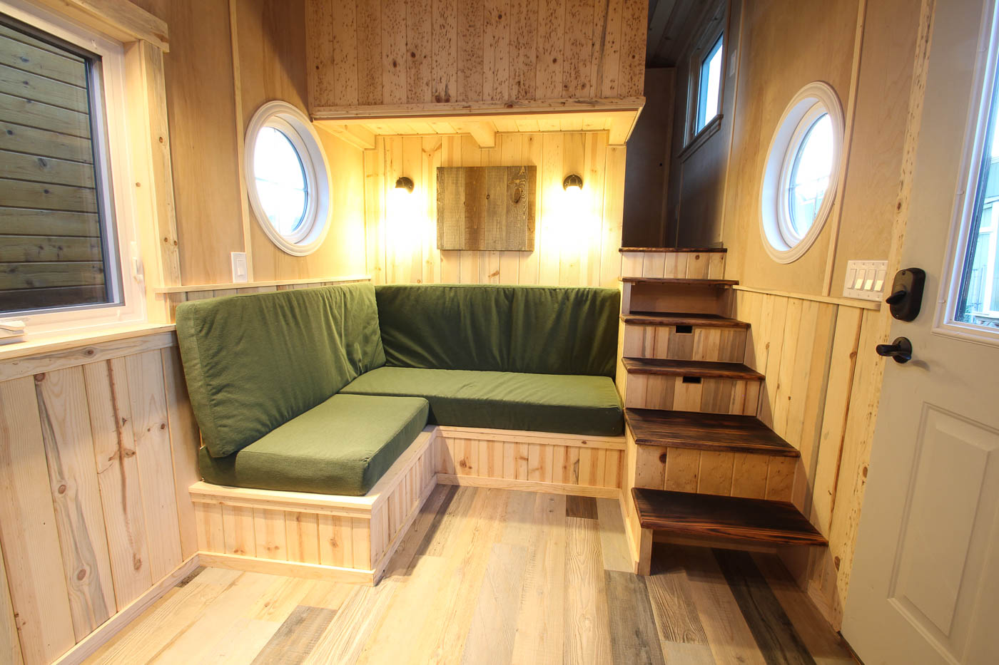 The shou-sugi ban stairs and exterior trim are water-resistant and can prove to be long-lasting while the appearance of these remains top-notch. The use of luxury vinyl planks for flooring as well as ceramic tiles ensures quality and durability. The kitchen stairs lead up to the loft with the capacity of a queen-sized mattress and both the lofts together can conveniently accommodate 4 people. The metal pro panel roof is a great feature that is rain and snow resistant and is prevents any water damage. It is also long lasting and safeguarded against fire risks from lightning plus has the added benefit of looking stylish.