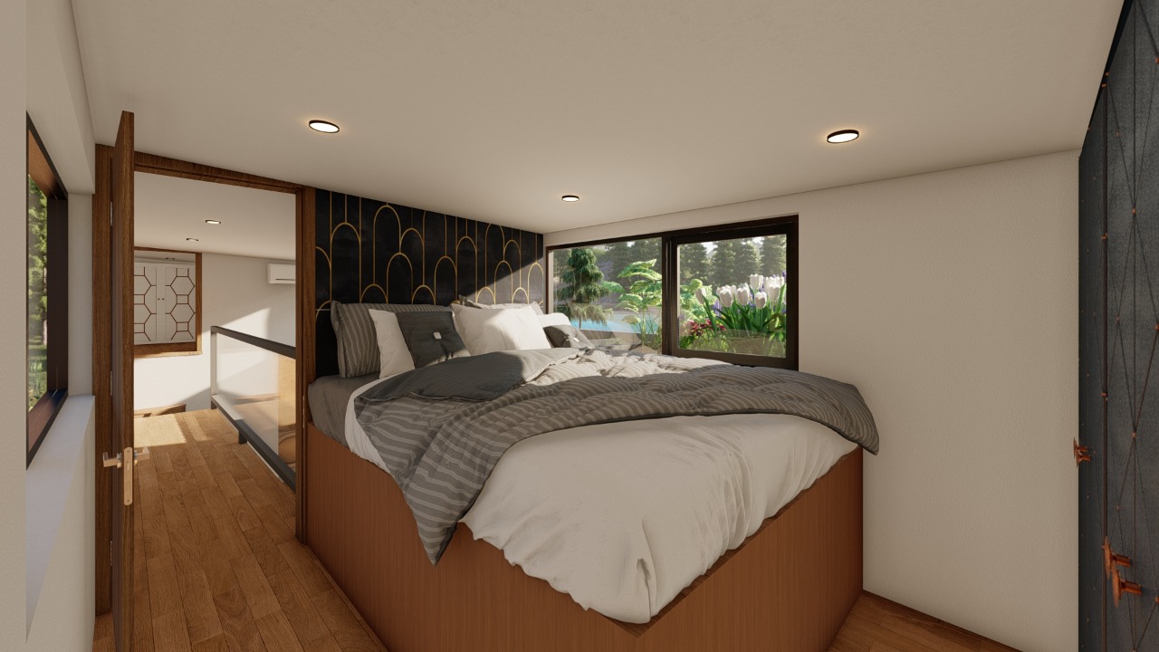 The design includes an innovative upstairs walkway that connects two full bedrooms. This feature adds an element of separation between the living areas and the bedrooms, ensuring privacy. The bedrooms, despite the home’s compact size, are comfortable and peaceful, offering a quiet escape.