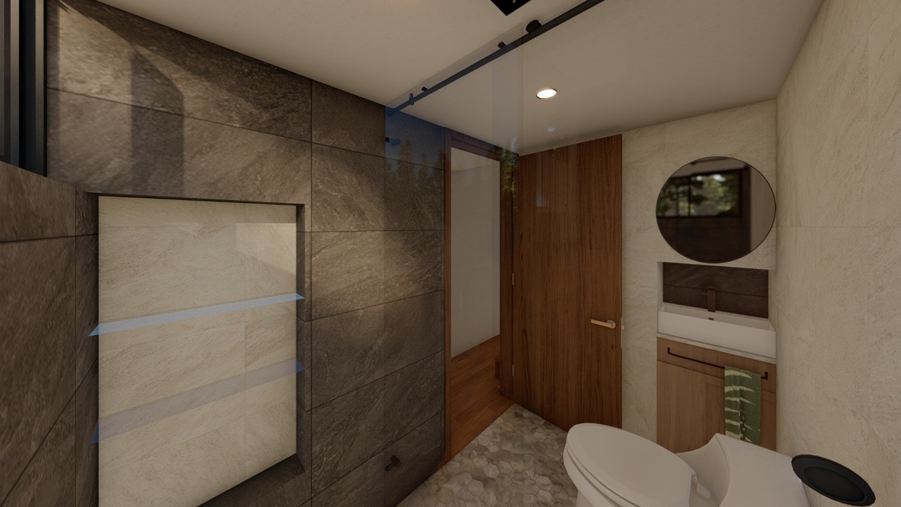 In the bathroom, the choice between a flush or compost toilet caters to different lifestyles and environmental considerations. The design of this space is a balance between practicality and style, emphasizing the home's overall theme of smart living.