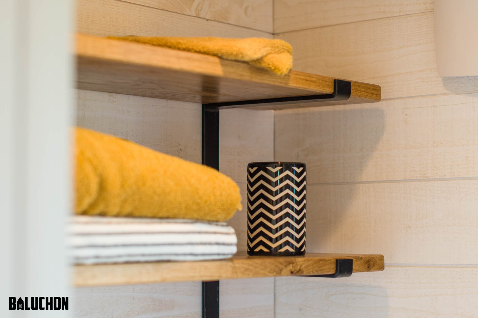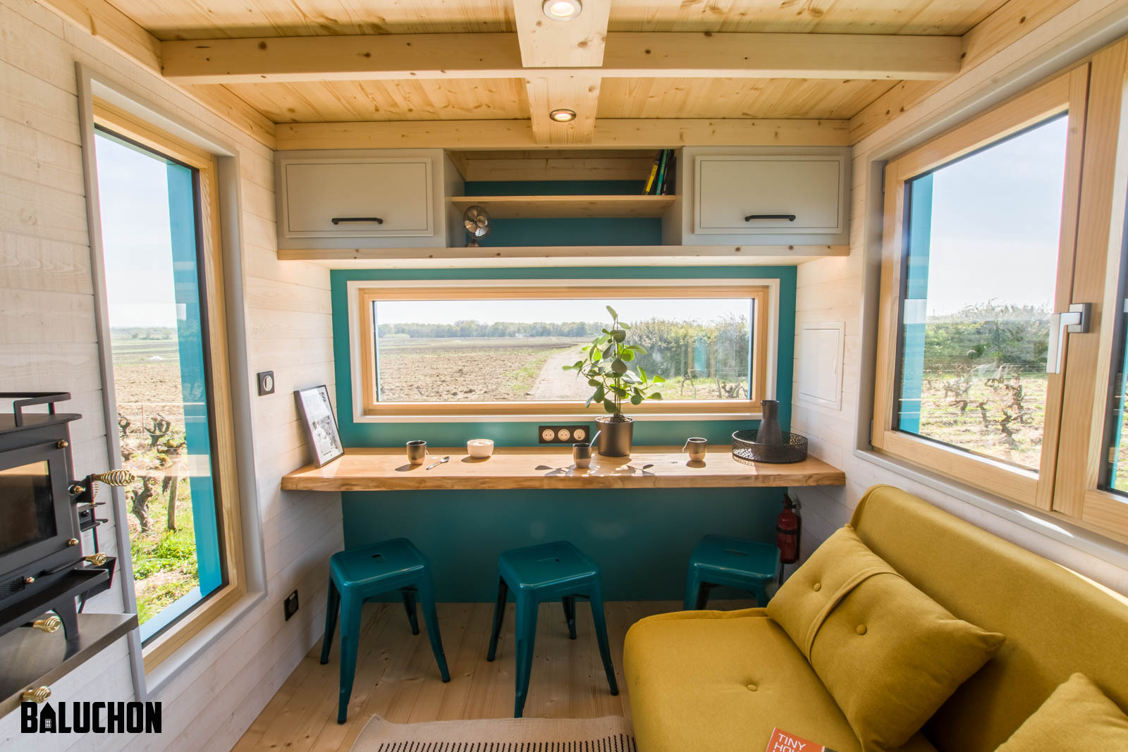 The long and broad structure of this tiny house on wheels is very attractive and also an uncommon characteristic in the field of tiny houses. The house exhibits fully oblique wooden planks used for external cladding that enhances its appearance. The choice of materials used to put together the structure of the house shows how much importance the manufacturer has given to building a house that is durable. The colours create a distinct look of the exterior and make the Sïana more appealing.