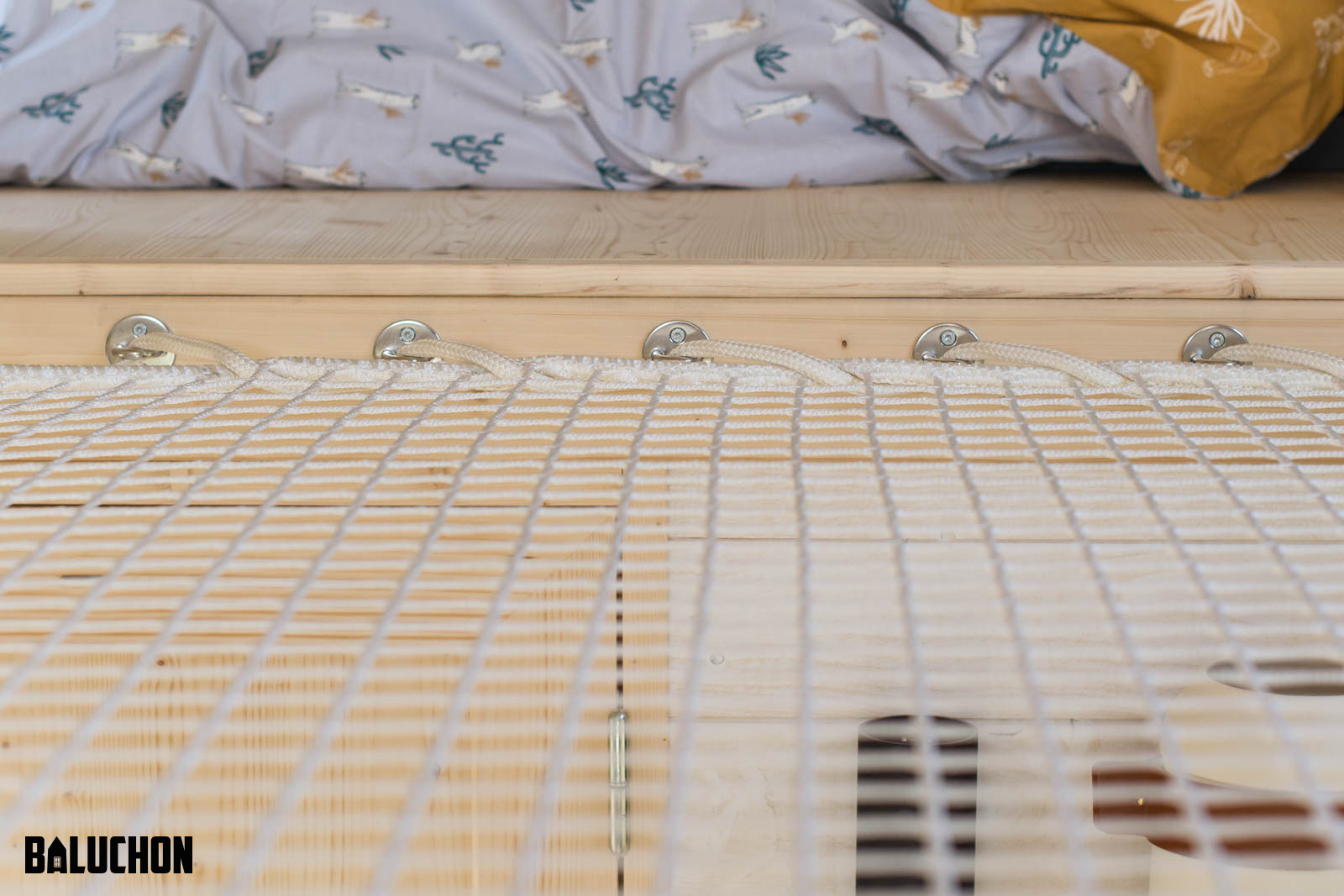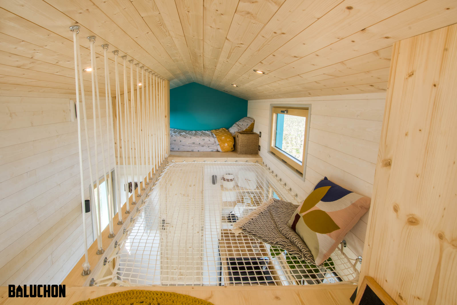 The bathroom is equipped with all the necessities and you get ample space to make use of the facilities. The most brilliant part of the house is the lofts that are surprisingly and creatively connected. The stairs leading up to the main loft has in-built storage space in a very chic manner. The cabinets get progressively taller with the height of the stairs and you can use them to hang your clothes or stack other personal items. The two lofts are connected with a taut net that in itself proves to be a fun sleeping place. Both the lofts can accommodate up to two people each which is why this is a great option for a small family. The taut net can be used for lounging or napping while enjoying the view of the main floor beneath.