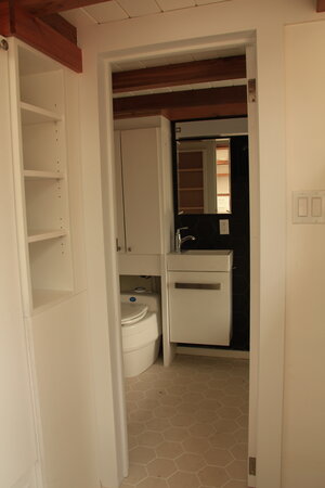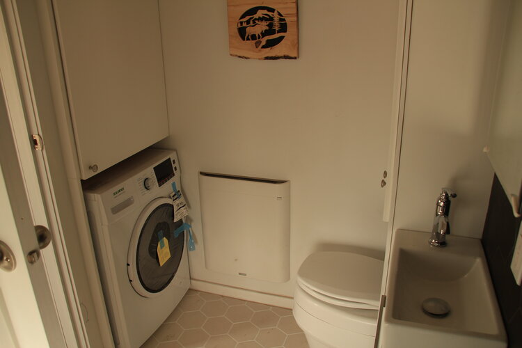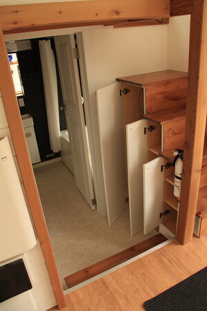 The kitchen offers plenty of storage space in different forms. You get open shelves, a series of cabinets and drawers that together aim to provide storage capacity to hold any cookware or packed goods that are required for cooking by the residents. The choice of customisation is open so as to give the owners of the house some authority over their living space and to let them add any personal touches to their home. A 2 burner propane cooktop or an electric one can be installed based on your preference. An apartment size refrigerator is also available that runs on propane or on 120 V electricity.