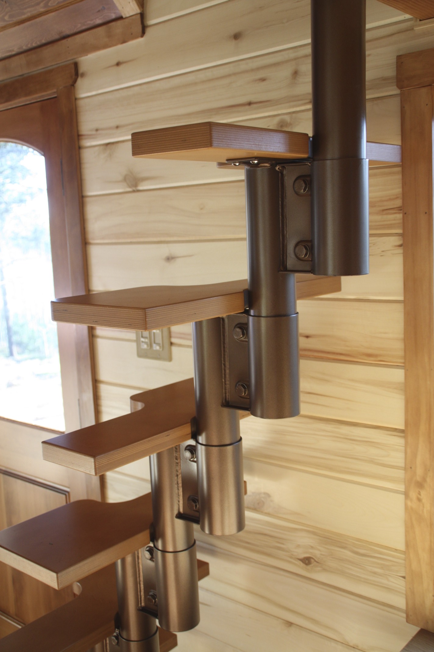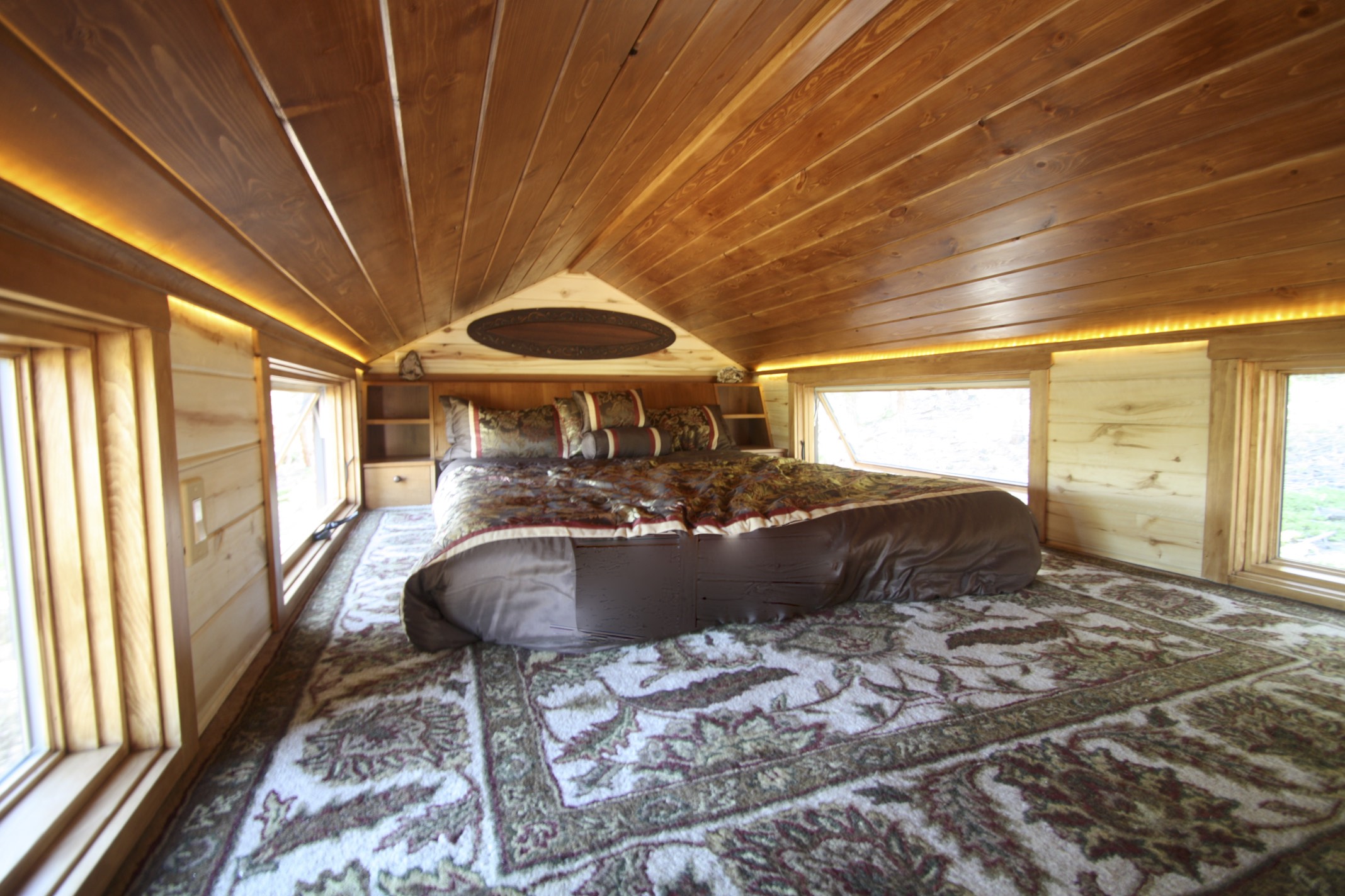 As you enter through the door you see wooden steps going up to the sleeping loft. The bedroom is quite spacious and comes with a storage option behind the bedding. Up to three people can easily manage to sleep there and the headspace is also fine. Windows are there that allow the sunlight to come into your bedroom.