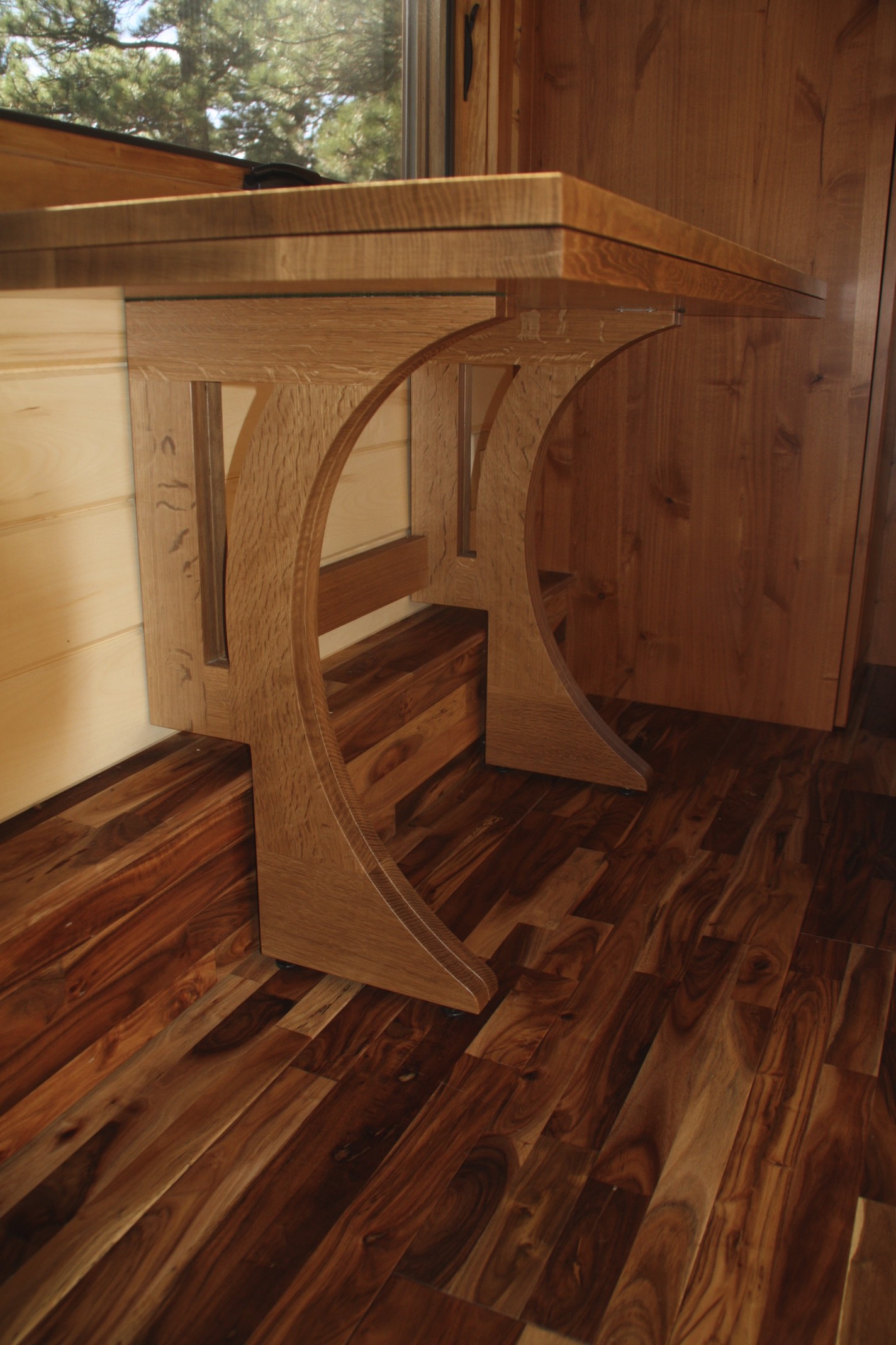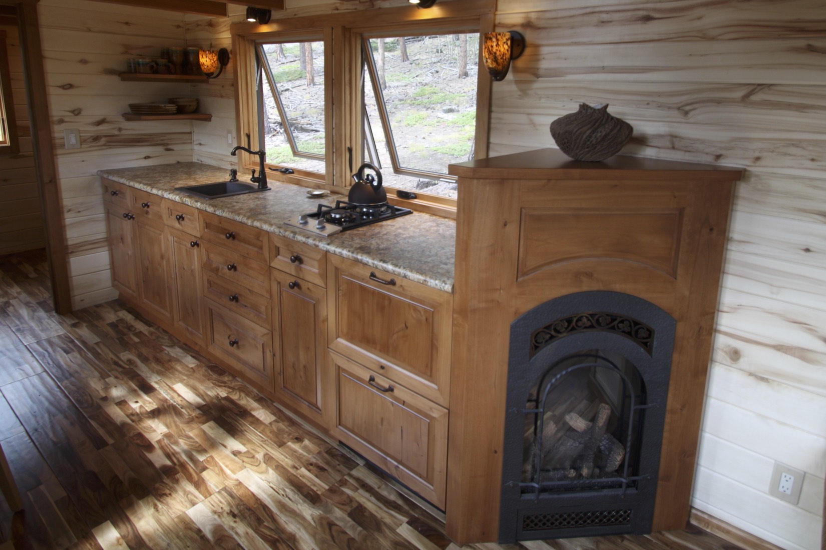As soon you enter this tiny house via a brown door that is half made of wood and half glass. You see a beautiful fireplace in the house that keeps your house warm during the winter season. On the right, you see a U-shaped sofa that is perfect for a group of 5 people. There are three rectangular windows that surround the living space. For ventilation, one can always open up the windows and take fresh air. You can have a fun time while seating in the living room with your friends or loved ones.