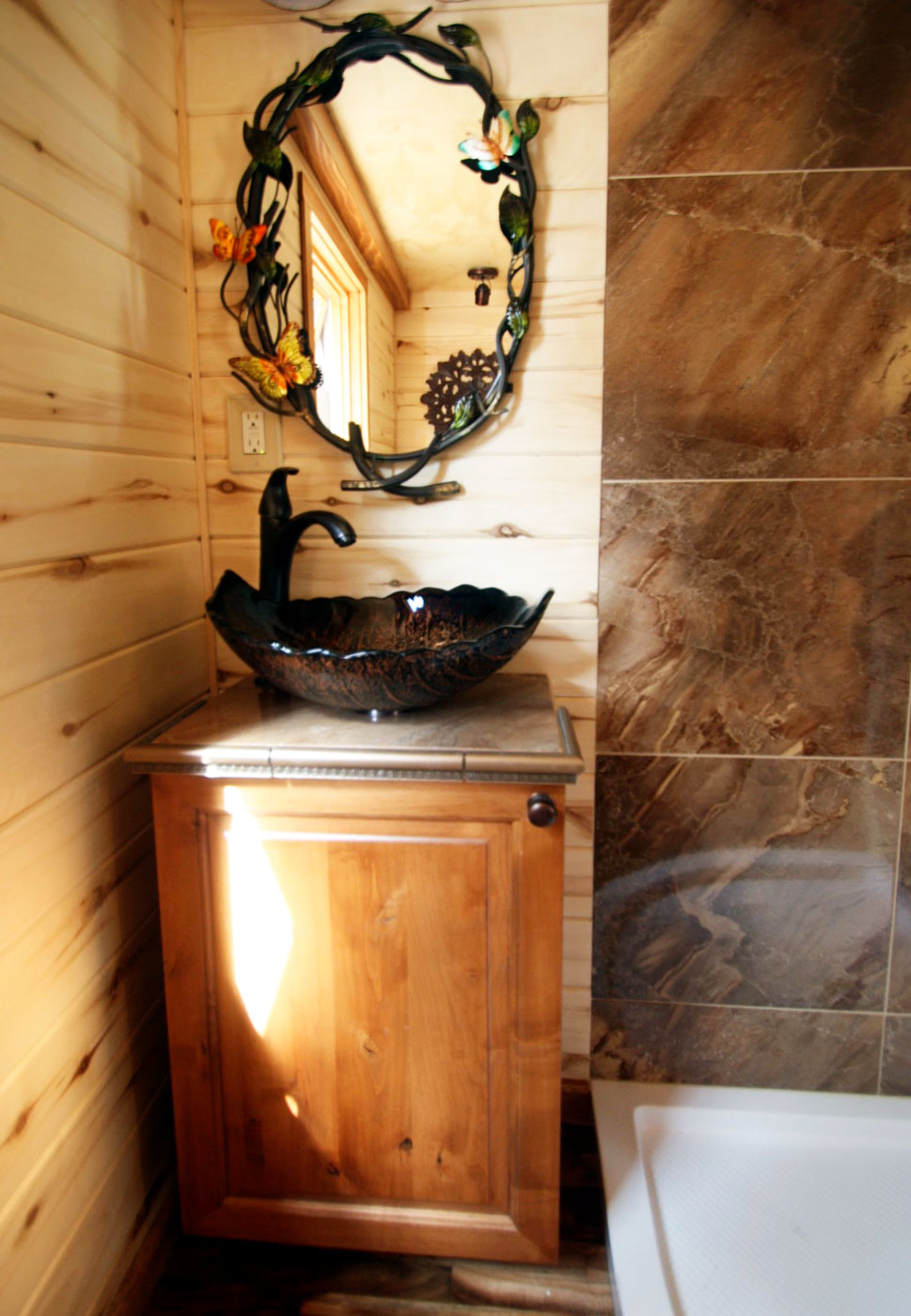 The bathroom is quite simple and it features a sink with a storage compartment, shower area, and toilet. A mirror over the sink is also there in the bathroom. Simple yet it is quite spacious rather than other tiny houses bathroom.