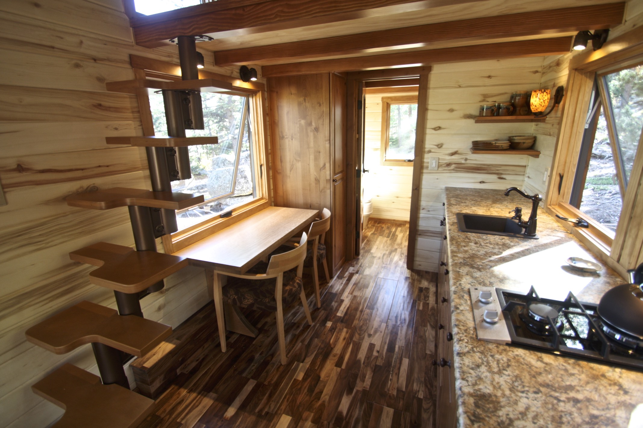 In the middle of this tiny house, you see your kitchen that is very minimal looking. The kitchen comes with a countertop, 2 gas burners, a sink, wooden shelves, and storage cabinets for storing your grocery essentials. Opposite the gas burner, you notice a table that is stuck to the wall along with two individual chairs and one can use this area as a dining space. A lot of storage option is available in the kitchen and wood finishing is all over the kitchen.