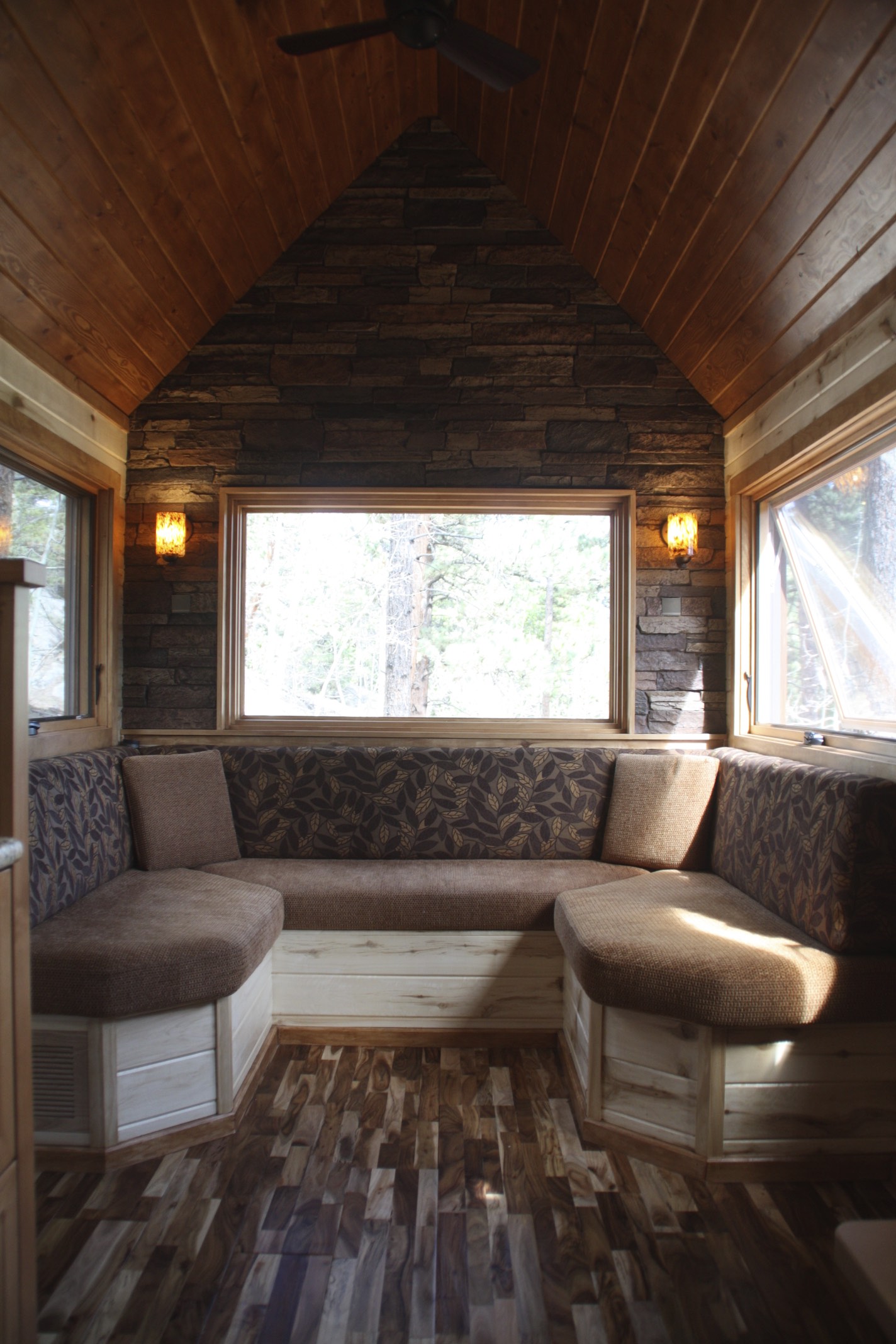 Stone cottage by SimBLISSity is one of the modest tiny houses in the market that features stonework on the exterior and a wooden interior. Living in this house feels like that you are living in the woods that is why modern woody living on wheels suits this tiny house. The stonework exterior adds up a little extra to this tiny house along with a brown rooftop. It features a sleeping loft, living space, dining area for two, kitchen, and a bathroom. The space utilization has been done perfectly in this modern tiny house. The total size of this compact house is around 204 square ft. There are a lot of windows that allow natural light to come into your house and it will save your electricity cost.