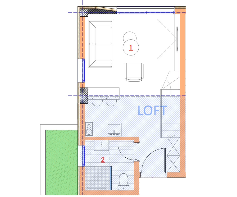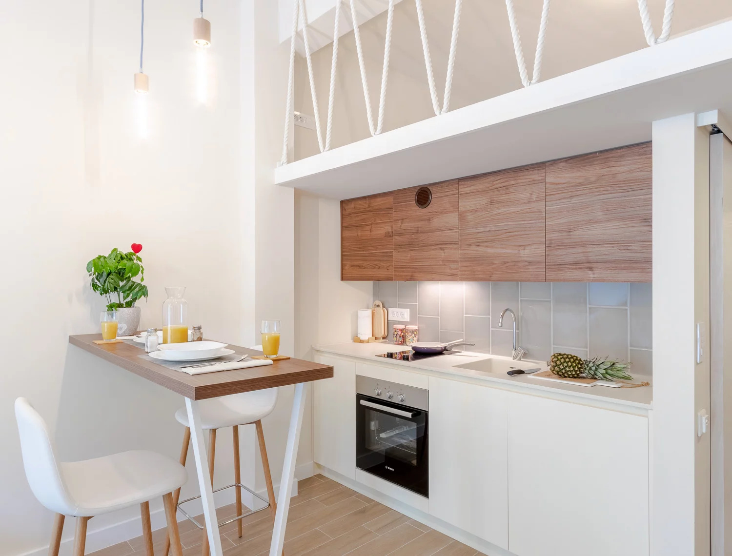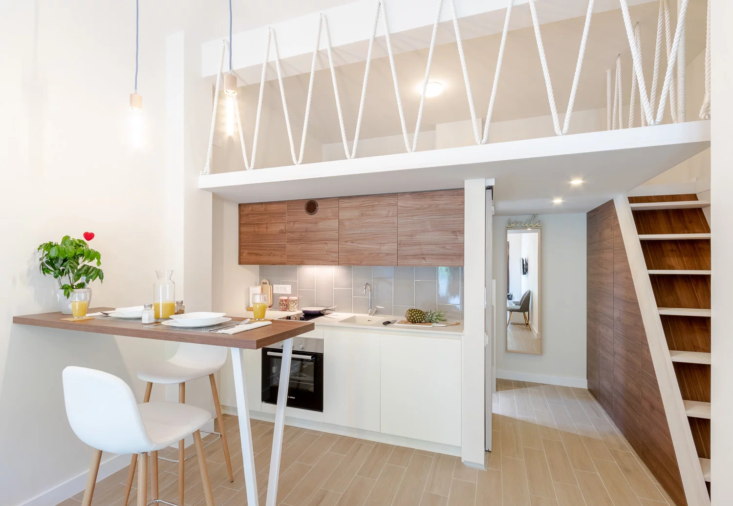Upon entering the studio apartment, the open-concept design immediately grabs your attention. The mezzanine adds an element of verticality, maximizing the use of space and providing a cozy sleeping area that overlooks the main living area. The seamless fusion of white walls, floors, and ceilings, paired with the muted gray and timber color palette, creates an inviting and spacious atmosphere.
