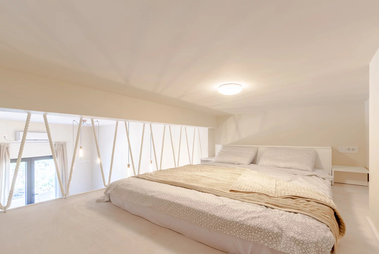 As you ascend to the mezzanine, the sleeping area offers a private retreat, cocooned in the soothing ambiance of the Studio Apartment. The comfortable bed and soft linens guarantee a restful night's sleep, while the clever use of storage solutions ensures a clutter-free space.