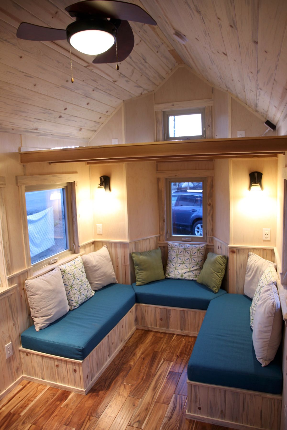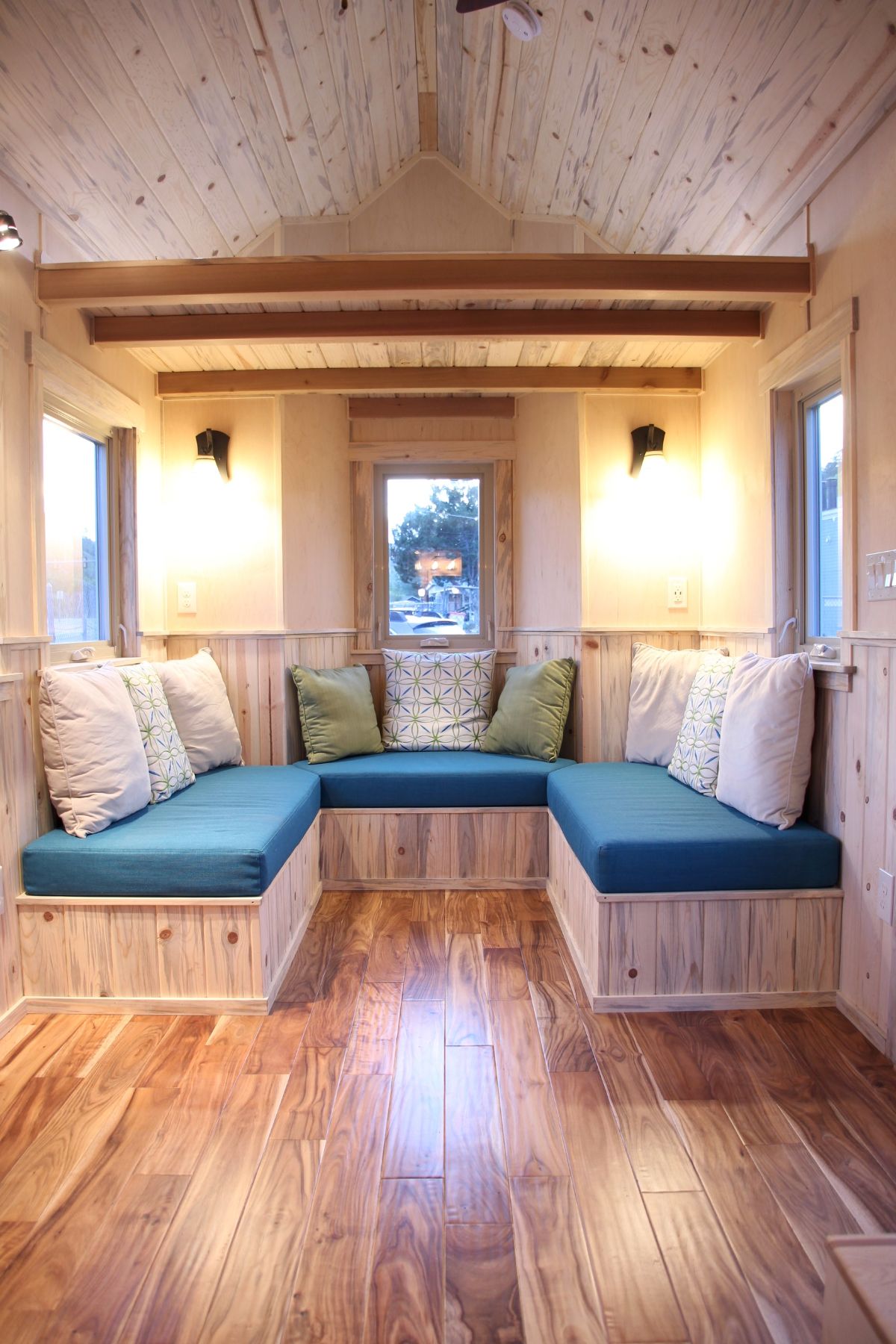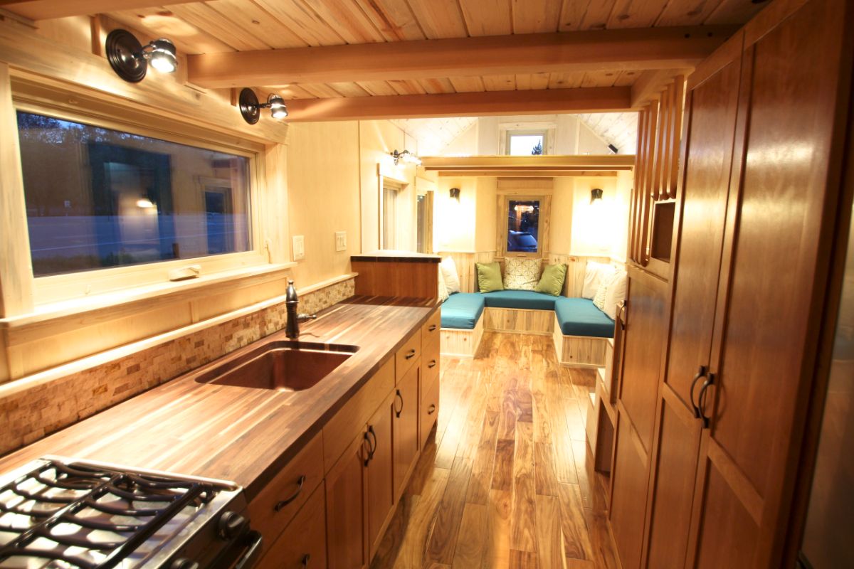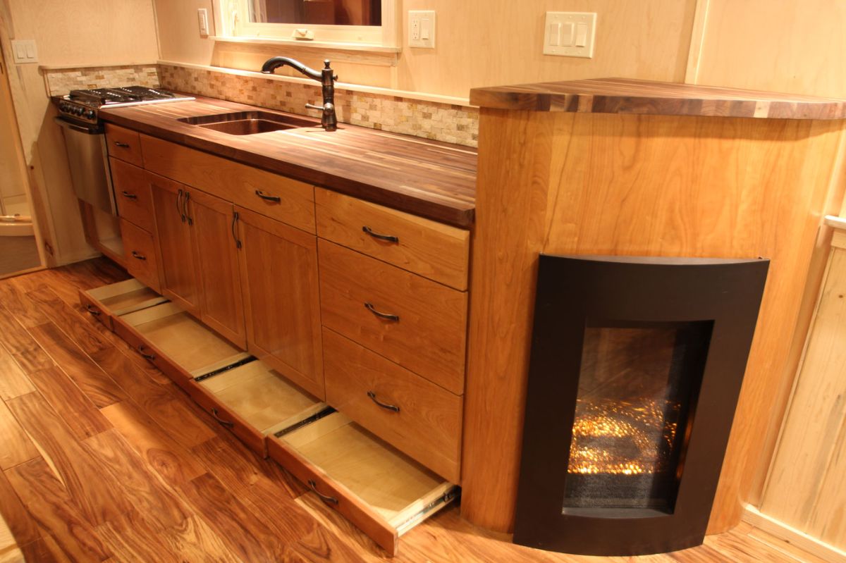 As soon you enter this tiny house via blue-colored glass and wood door, on the right side, you see your living space. It comes with a U-shaped in-built sitting space with blue seats. Up to 6 people can comfortably sit in the living area. There is storage left made above the living area for storing your excess things and essential house types of equipment. One can also convert this storage loft into a guest loft, so whenever your guest shows up, they can stay up in there. A fireplace is also there in the living area for keeping you warm