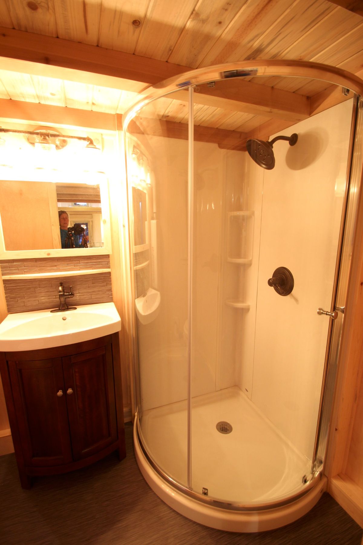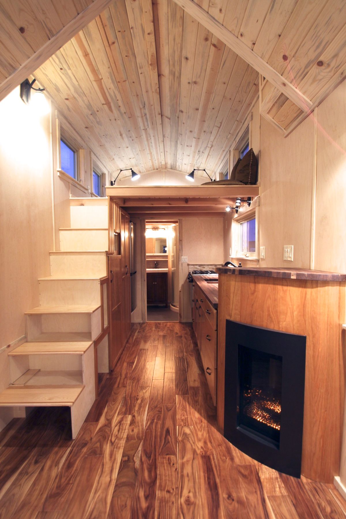 As you step to toward the left part of this tiny house, you see your kitchen that looks chic and modern at the same time. It features a countertop, sink, storage cabinets, gas burner, oven/microwave, and refrigerator. a few full-size storage cabinets can also be seen in the kitchen. This kitchen is compact but it is one of the best kitchens one can find in a tiny house. Next to the kitchen, one will see a bathroom and above the kitchen, there is the sleeping space. The copper sink adds up a little extra to the overall look of this tiny house manufactured by SimBLISSity.