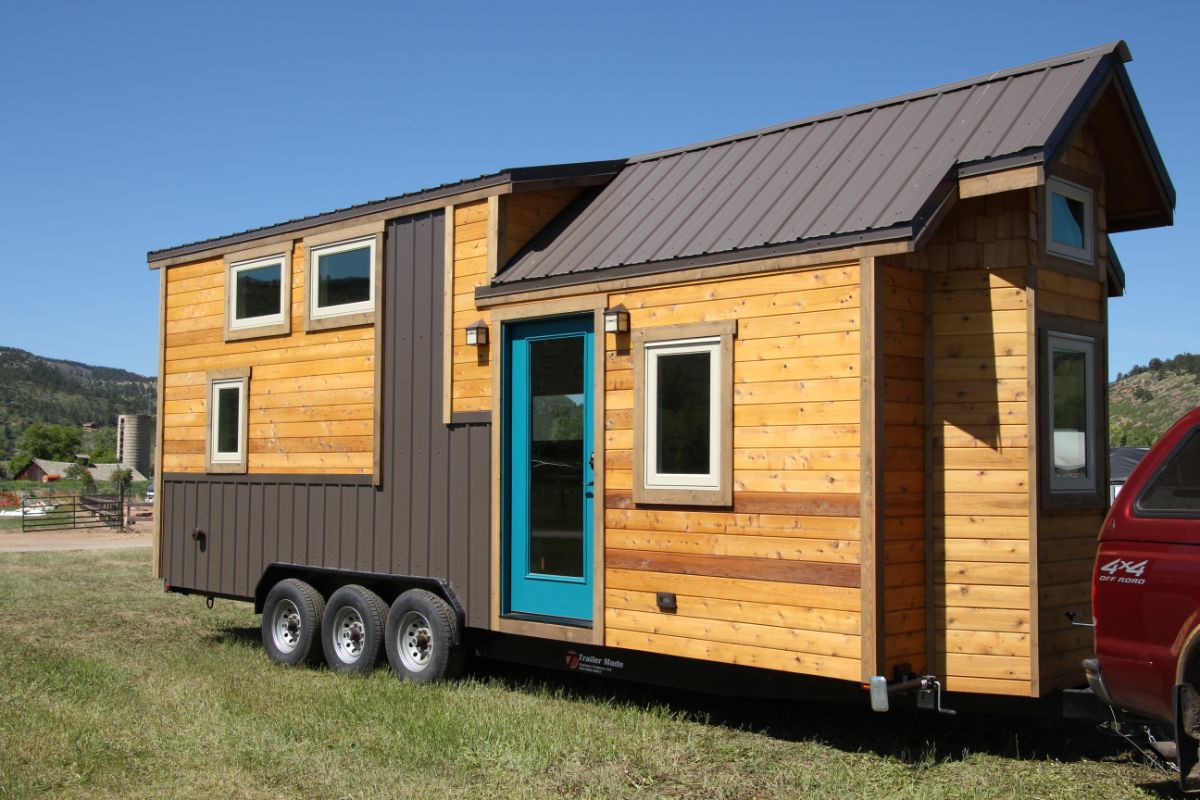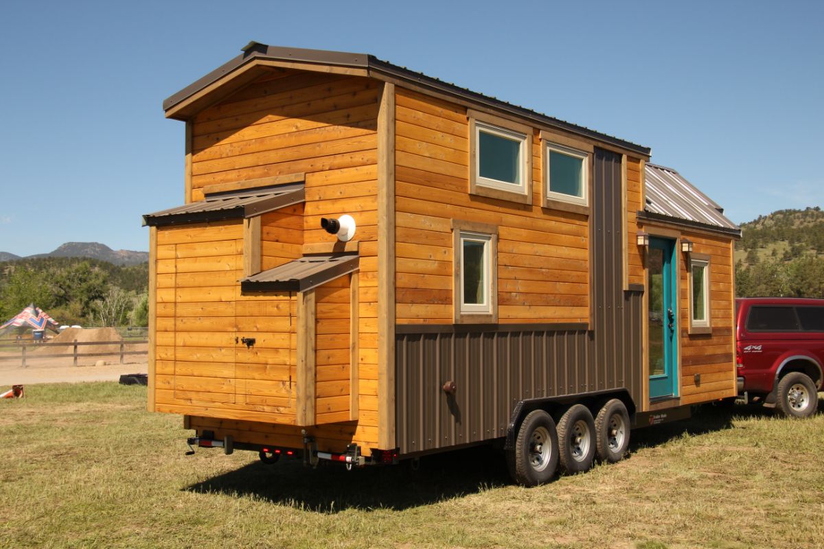 The exterior of this tiny house features cedar wood finishes along with metal panels colored in dark grey. A lot of glass windows are there in the house for fresh air along with natural lighting. This tiny house features a bedroom, bathroom, kitchen, and living loft. Proper storage space is there in the house for storing your important stuff i.e., from groceries, utensils to clothes, etc. The interior of this house is also very beautiful and minimalist. The blue color door and interior give this tiny house some plus points.