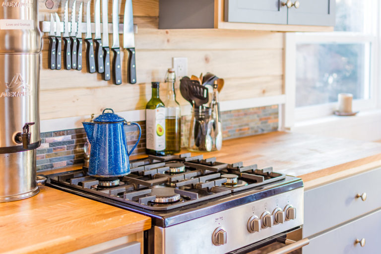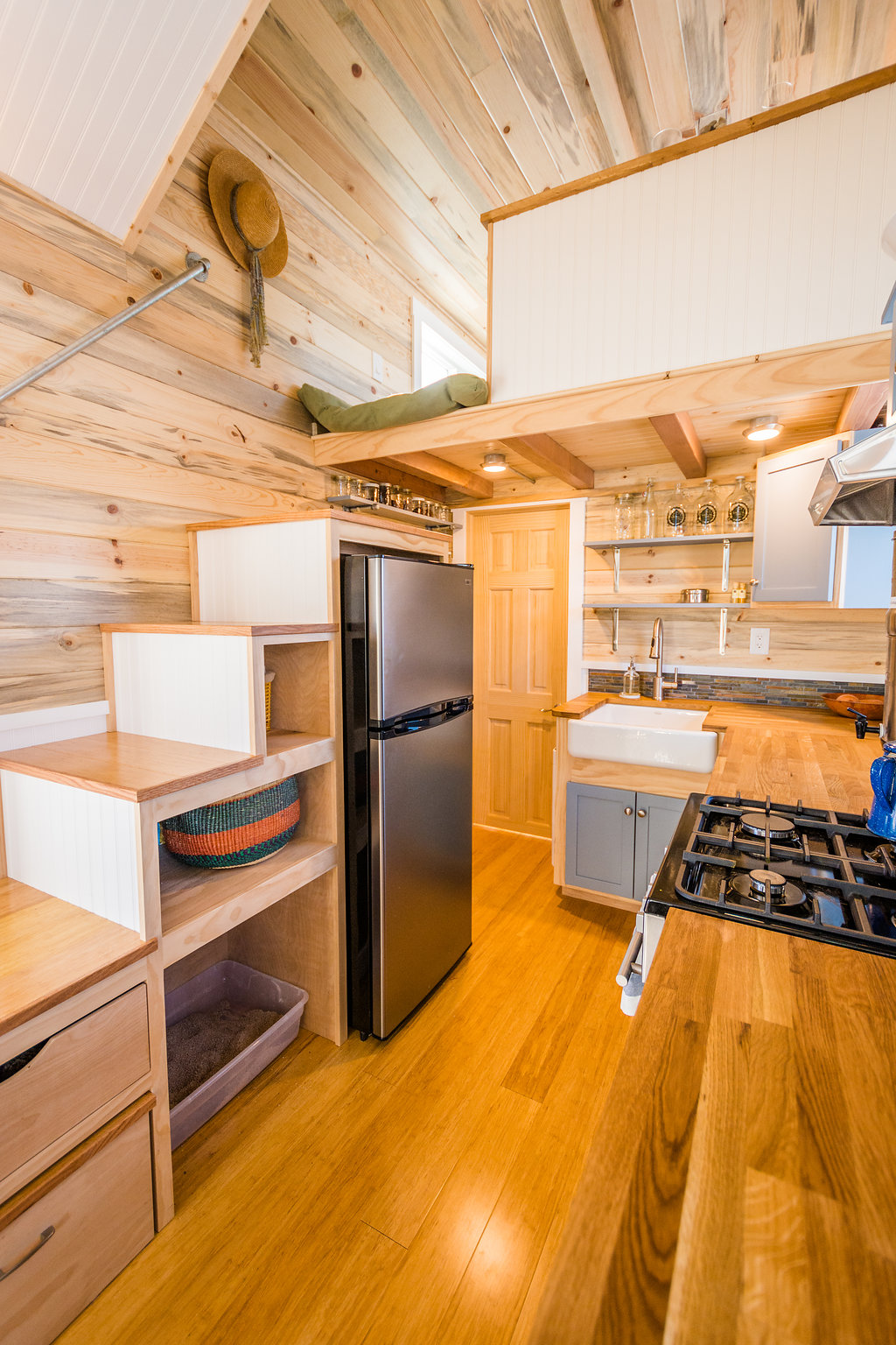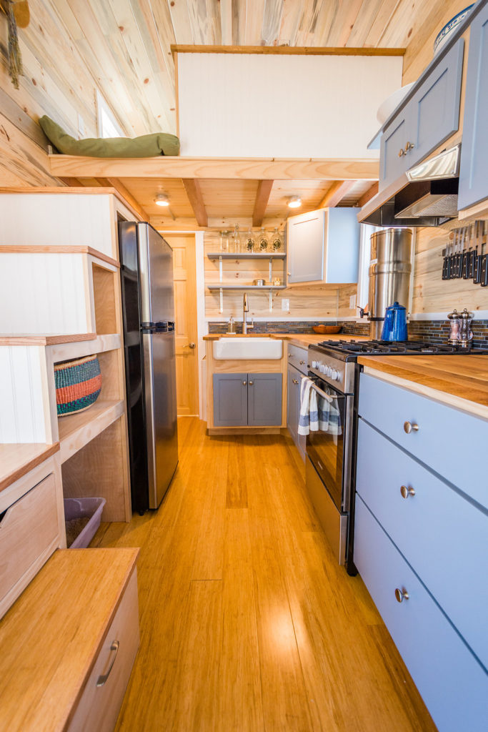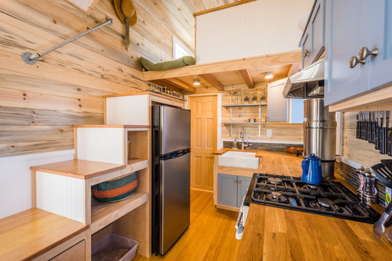 As you enter through a white glass door that looks chic and you see your kitchen. The first thing you will notice in your tiny house is your kitchen. The kitchen area is very modern and farmhouse type as it is based on a farmhouse theme. You get a 4 stove burner, hood, refrigerator, microwave/Owen, sink with taps, L-shaped countertop, and storage space. Along with the kitchen, there is a foldable shelf that turns into a table for 4. One can invite their friends for dinner and spend quality time with them. Over the storage space in the kitchen, you can store your books and showcase things.