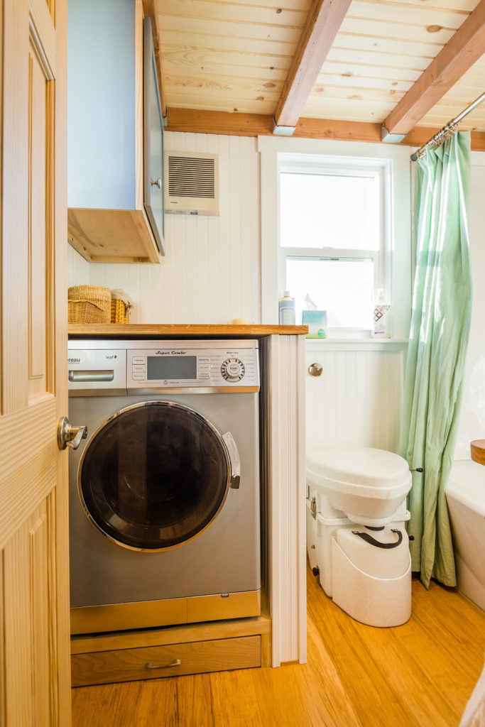 Next to the kitchen, you will enter your tiny but very beautiful bathroom that features a full-size bathtub, washbasin with vanity, and composting toilet. Charging spots are also there in the bathroom. T