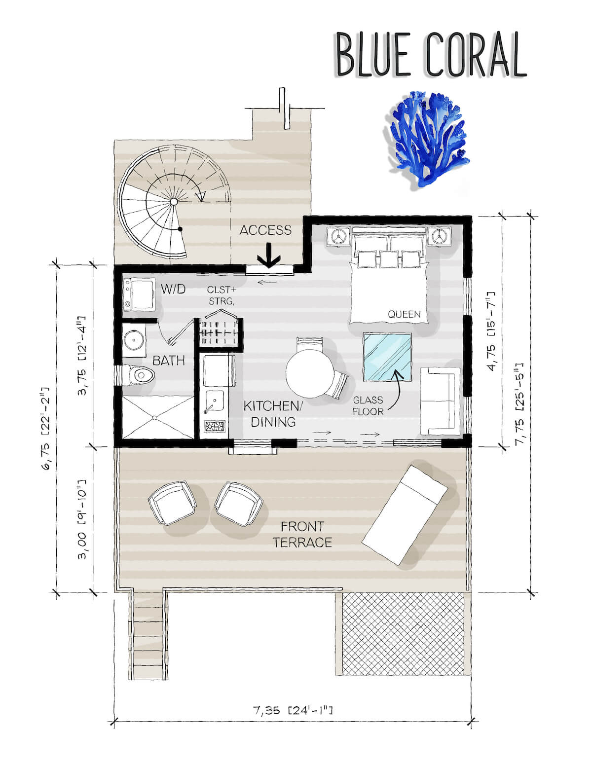 To enhance the interior’s style factor, a piece of glass floor is installed in a square shape that really stands out from the rest of the house. The bathroom is quite big for two people and comes bearing a standard toilet, a vanity combination and a decent bathing section. There is also space for a washer and dryer combo to be placed outside the bathroom door. The bedroom holds a queen size bed and sleeps up to two people comfortably.