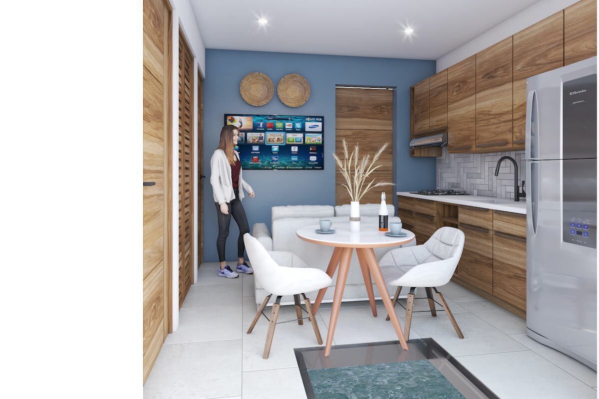The wide front terrace is one of the many amazing and captivating features offered by the Sea Turtle as you get to lounge outside and enjoy some cosy family time. If you wish to practice yoga, a palapa is also available for you to make use of and feel more connected to nature. The living room holds a small couch for two and you can relax here while watching television. The open kitchen dining area is adjacent to the relaxing space and you are provided with a compact circular dining table with 2 cushioned chairs.
