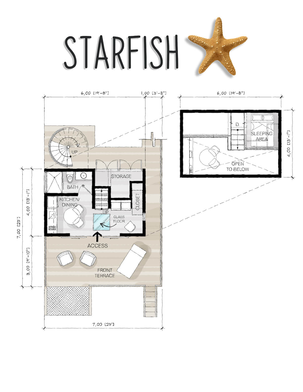 The layout of the Starfish is pretty basic but the built and design is very impressive. The community feature is an added perk that makes up for the cramped layout. The exterior offers a lot of space as you get a wide front terrace. You can place patio furniture and lounge outdoors to enjoy the beauty of nature and bask in the sun. The living room is commodious enough for two people to relax comfortably. The striking feature of the Starfish is a square shaped section of glass floor that is placed in the living room’s floor.