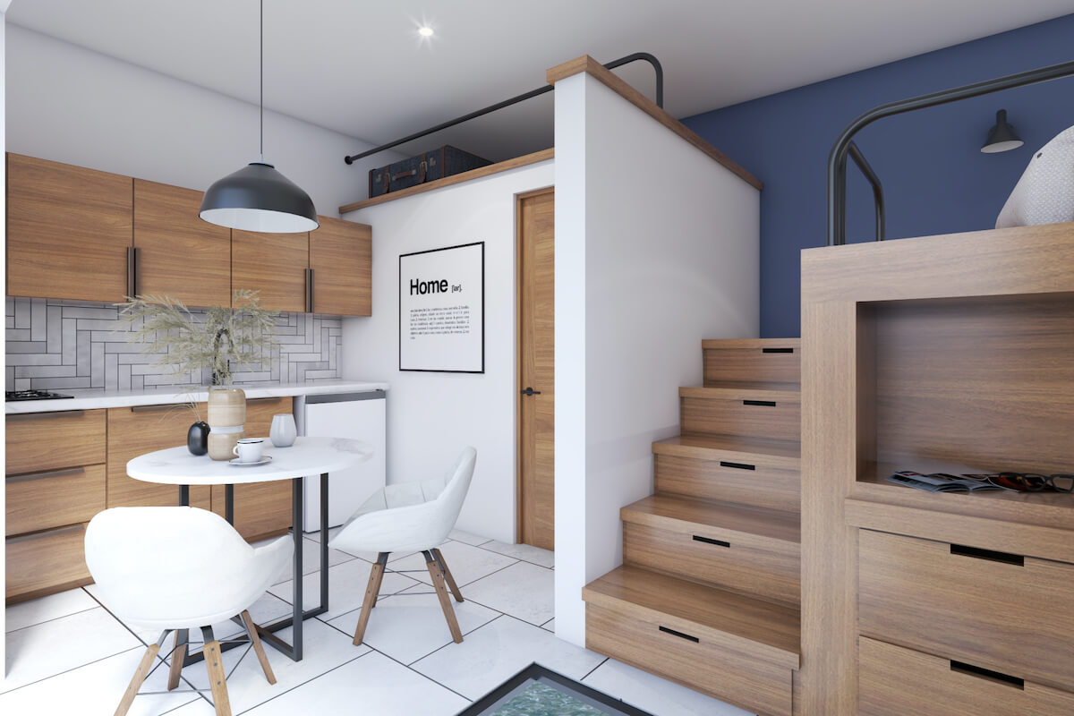 It lets you get a hint of the scenic beauty of what lays underneath and feel closer to nature. Additionally, this is a great interior décor piece that makes a style statement. The kitchen can dining area emits homely vibes while being super snazzy and contemporary in style. A long single counter is affixed in the wall and a dining table with two chairs is also available to complete the look.