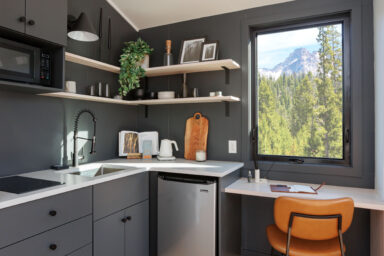 The kitchen is a culinary haven with birch cabinets, flat panel doors and drawer fronts, and full-extension, soft-close drawers. It is equipped with an electric cooktop, microwave, and under-counter fridge. Adjacent to the kitchen, a cozy eating nook offers a charming space to savor meals while enjoying the view.
