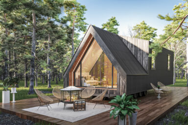 The sleek and contemporary exterior of the A-Frame park model boasts matte black corrugated metal roofing and select cedar siding. Adorned with Paradigm black vinyl windows from the 8300 series and a ProVia full-glass entry door, the exterior is as stylish as it is durable. The strategically placed front door provides remote access to the home, while the generous number of windows throughout allows natural light to permeate every corner.